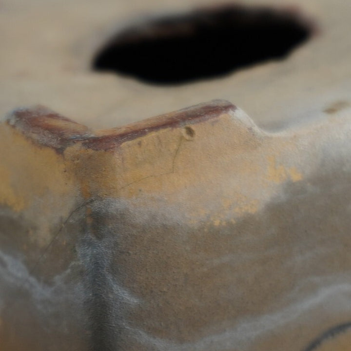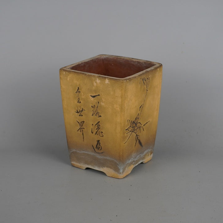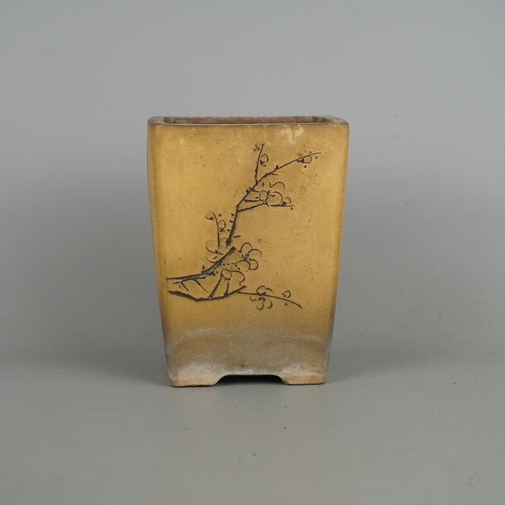 盆栽鉢 落款あり 小型 高さ 約13.3cm 正方鉢 彫入 梅 笹 詩 白泥 観賞用 現品 中古鉢 品名落款あり...