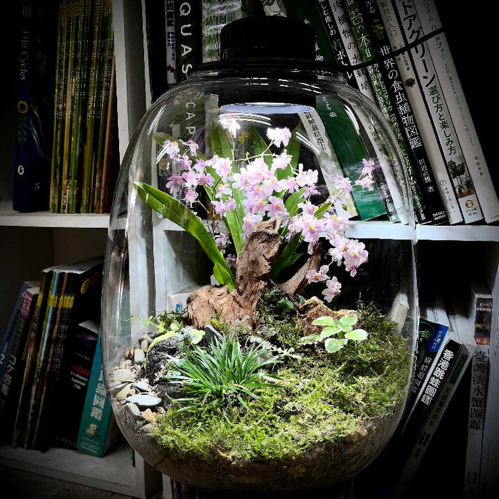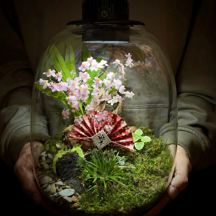 Materials: includingprofessional landscaping eco-bottle with light and fan(can be plugged in via USB), dream orchid, various plants and landscaping materials