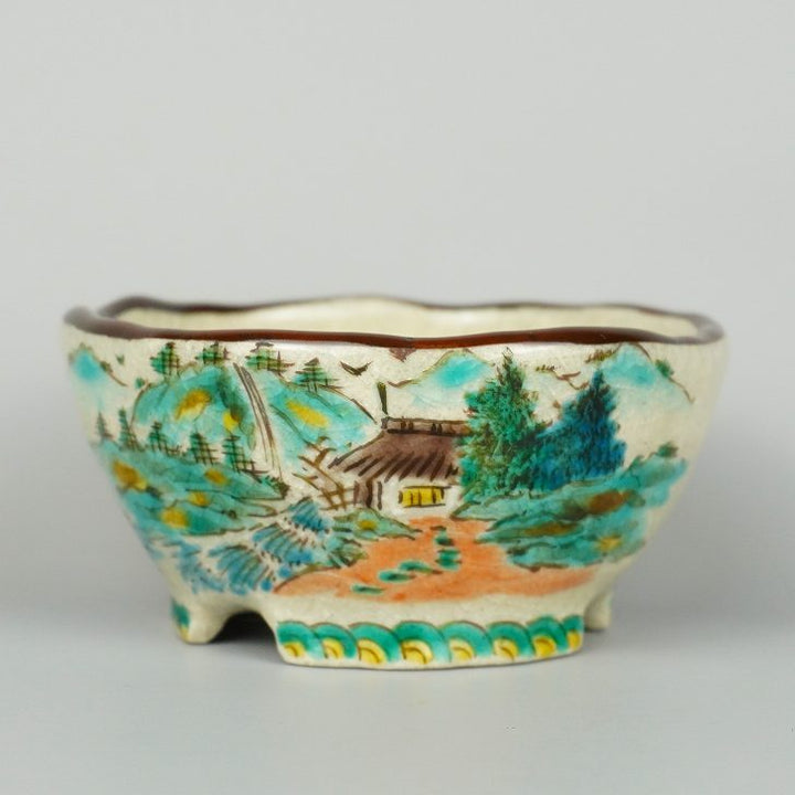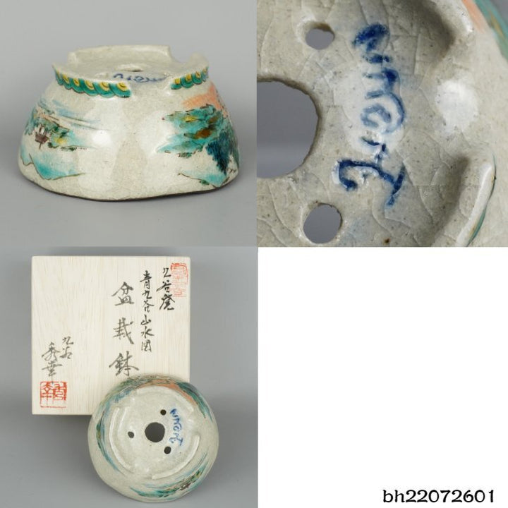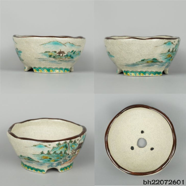 盆栽鉢 てるみ ボデー 九谷画 九谷 秀幸 小鉢 長辺 約 9cm 丸鉢 青九谷 山水図 共箱 観賞用 新品 s1198414076