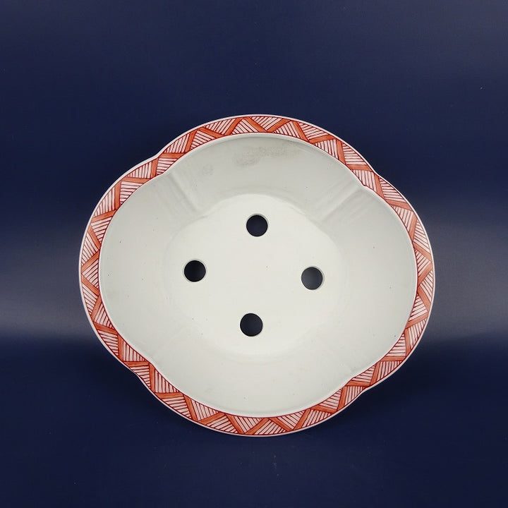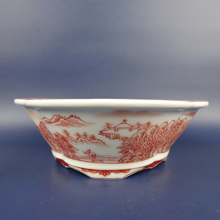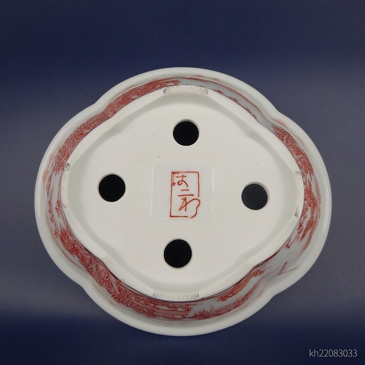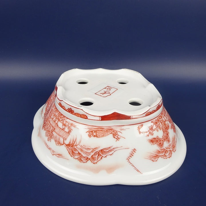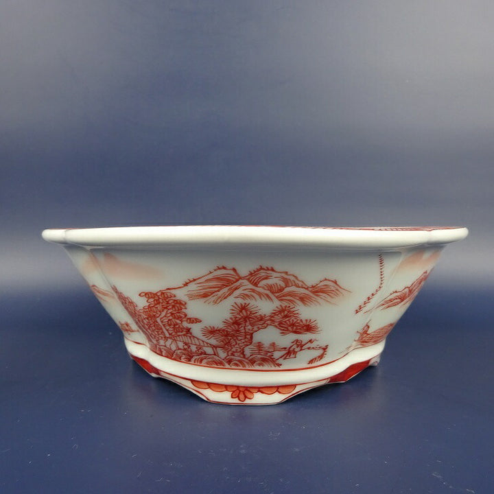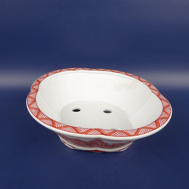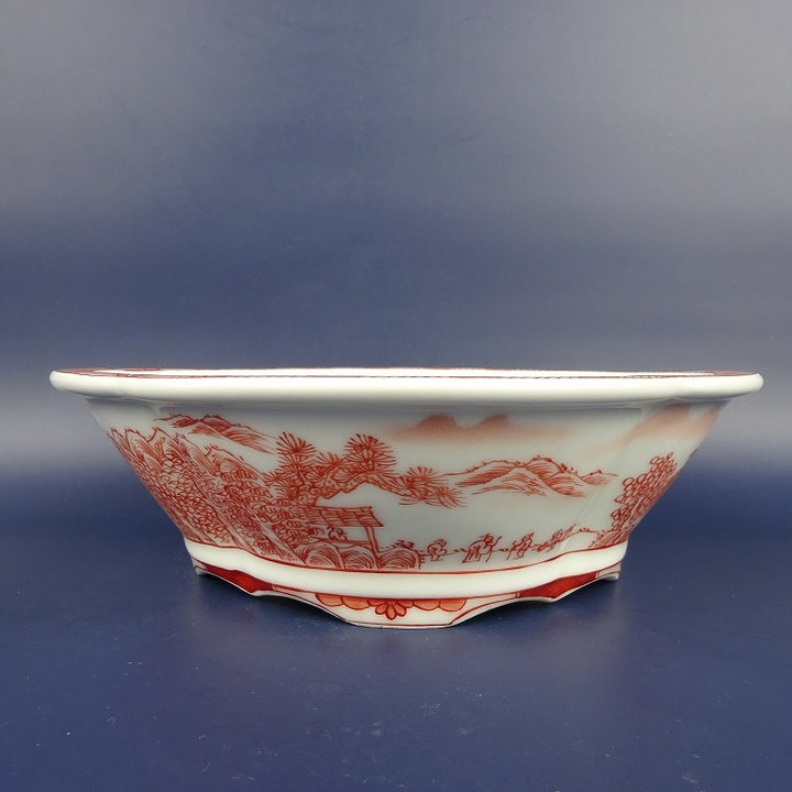 盆栽鉢 は二わ オリジナル鉢 中型 長辺 約21.1cm 木瓜鉢 赤絵 山水 風景画 外縁 観賞用 新品 q1198418456