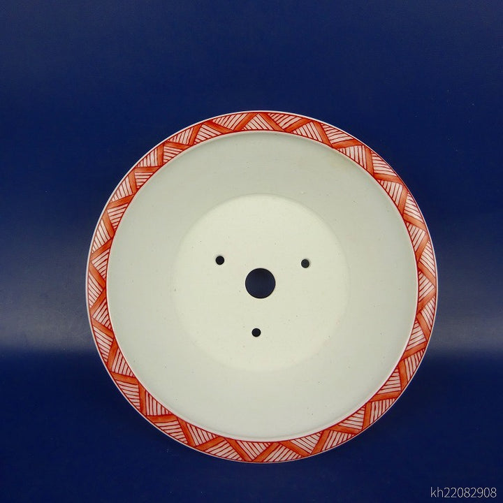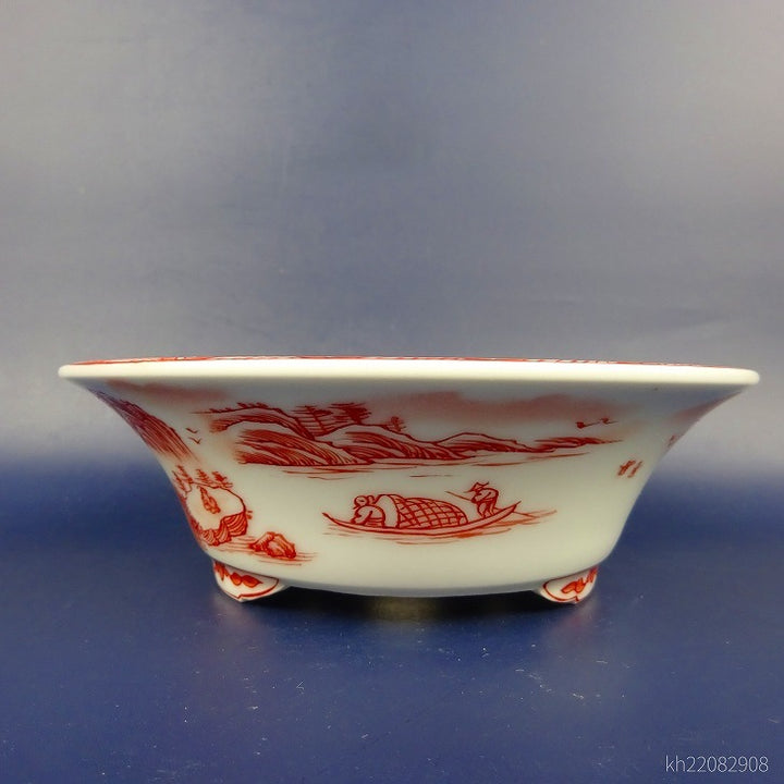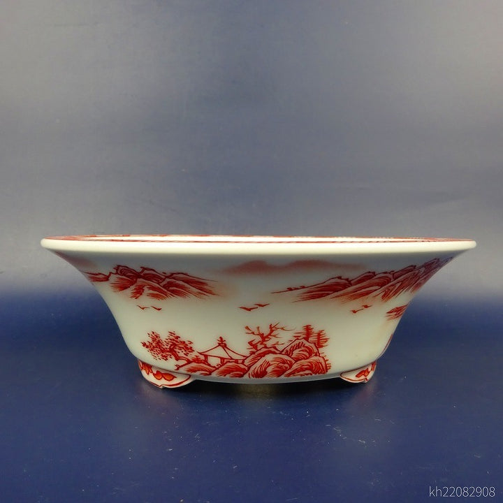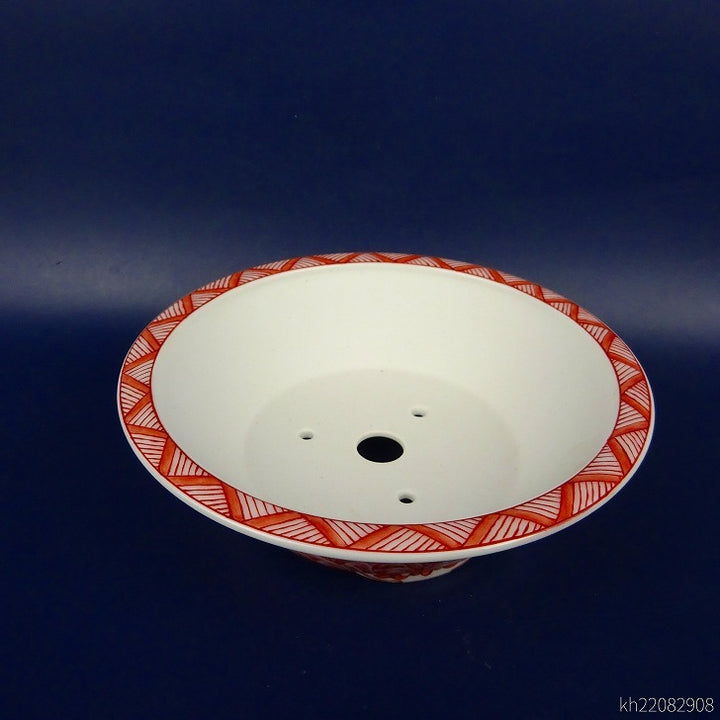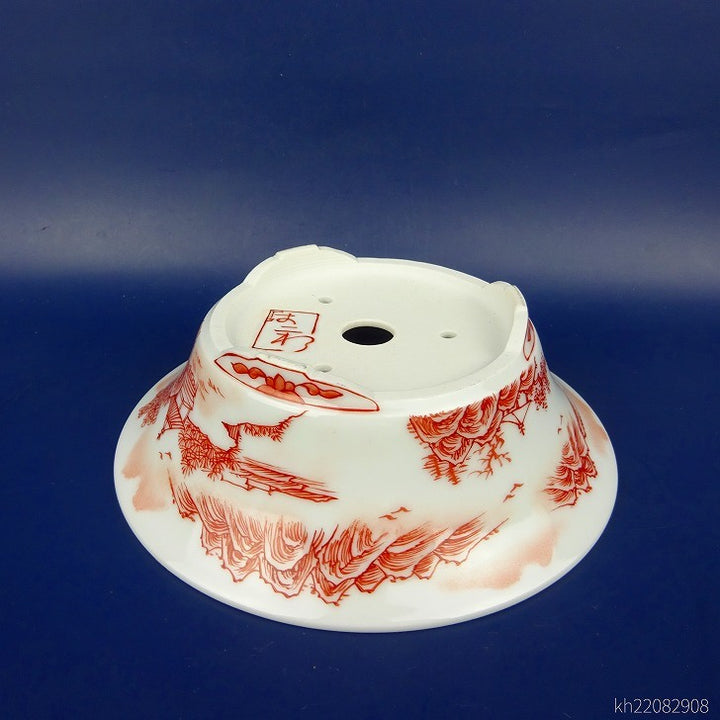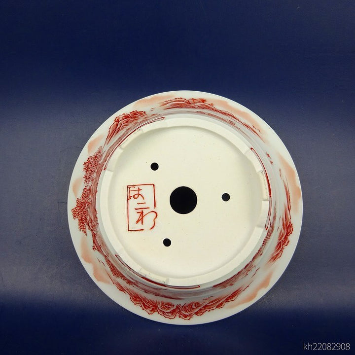 盆栽鉢 は二わ オリジナル鉢 小型 長辺 約15.5cm 丸鉢 赤絵 山水図 風景画 新品 v1198441858