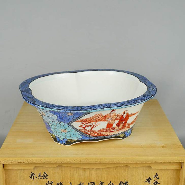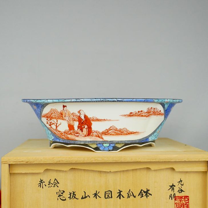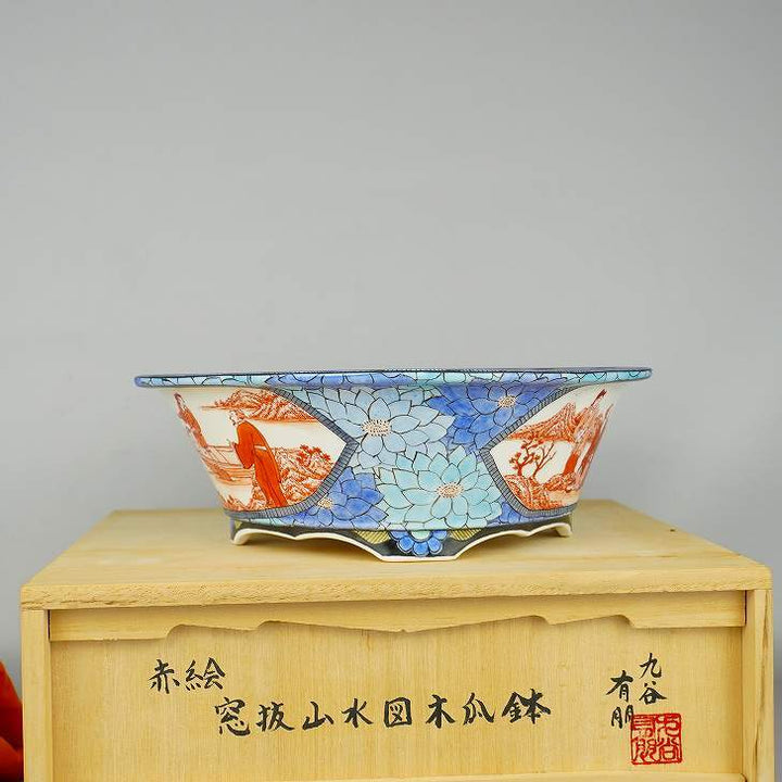 盆栽鉢 九谷 有朋 中型 長辺 約 24cm 木瓜鉢 赤絵 花詰 窓抜 山水図 共布 共箱 観賞用 新品 l1198412369