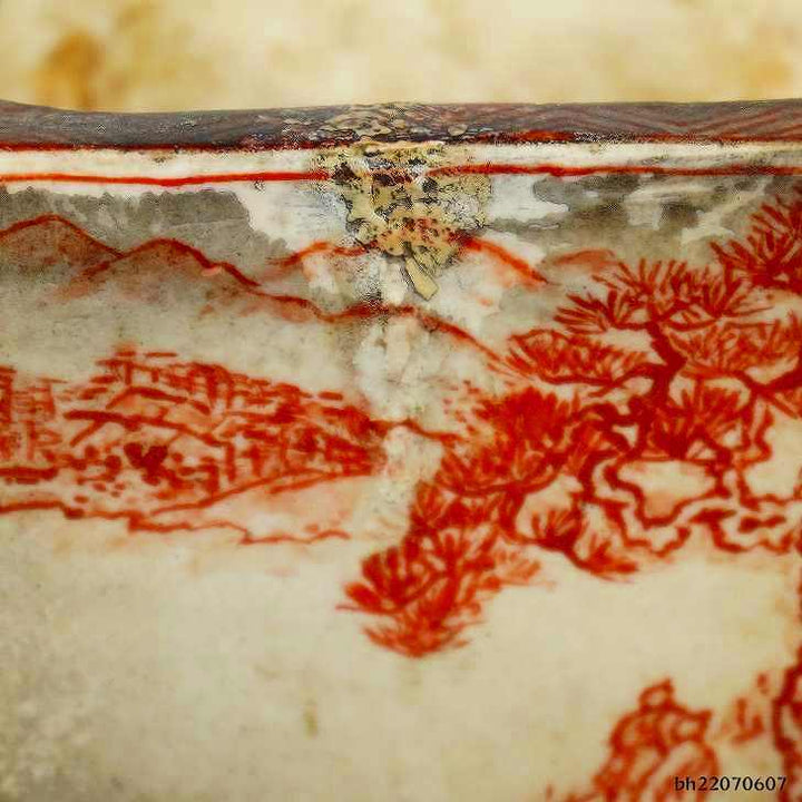 盆栽鉢 彦山人 小鉢 長辺 約 5.8cm 正方鉢 赤絵 山水画 中古鉢 l1198413277