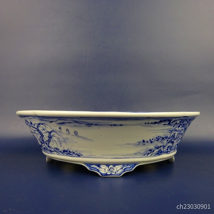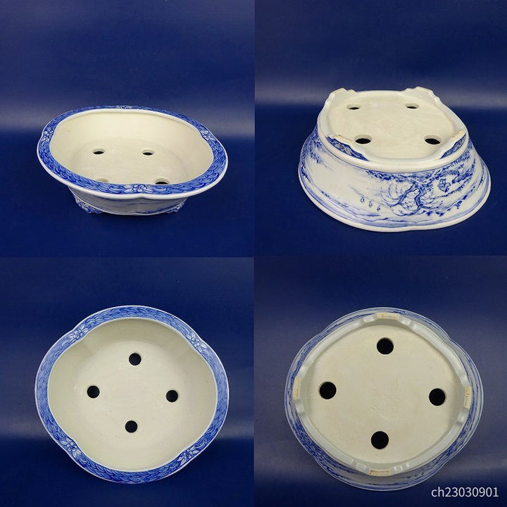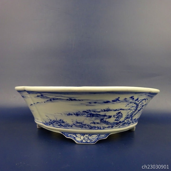 盆栽鉢 月之輪 正泉 小型 長辺 約18cm 木瓜鉢 共布 共箱 青絵 訪友図 染付 山水図 新品 l1198413069