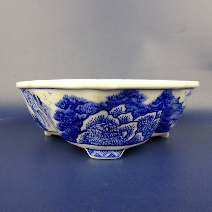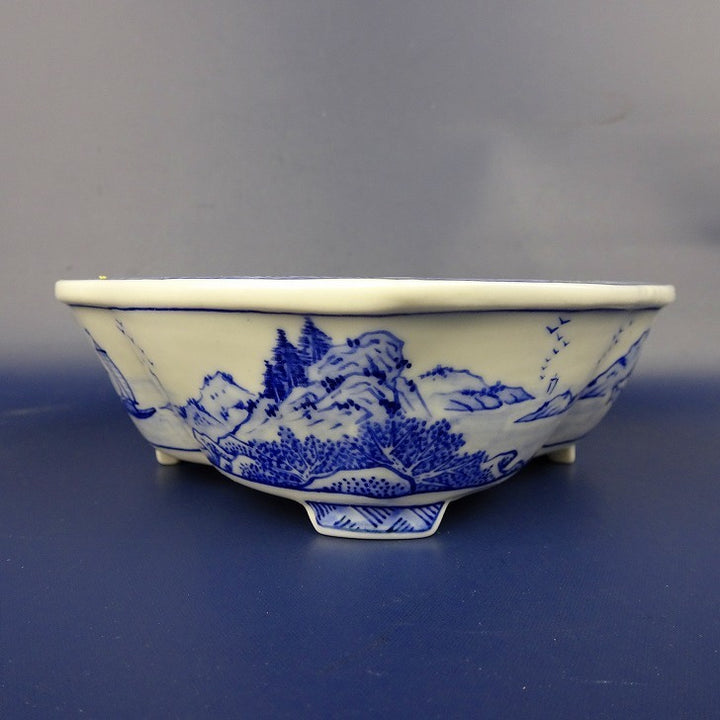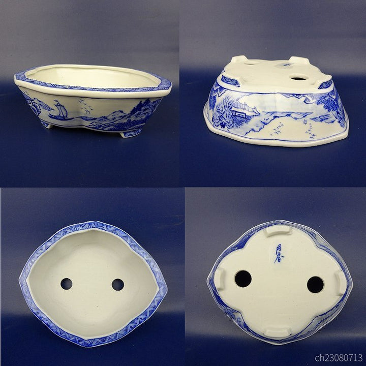 盆栽鉢 月香 小型 長辺 約16.6cm 木瓜鉢 染付 山水 閣図 共箱 共布 観賞用 新品 v1198442861