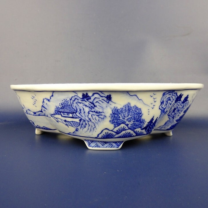 盆栽鉢 月香 小型 長辺 約16.6cm 木瓜鉢 染付 山水楼閣図 共箱 共布 観賞用 現品 新品 本名 伊藤 寧俊 丹鏡窯四代目。昭和44年頃から染付鉢を作り始める。 名種展示会で最優秀作家賞,樹石社賞、近代出版社賞など流麗な筆致の染付、赤絵、色絵が高い評価を受け数多くの受賞歴があります。 絵は涌泉の影響が大きく、初期の細密に書き込む作風から徐々に線の太い省筆画に推移、色使いにも変化が見られ清潔感に満ちた筆致は月香どくとくです。型を用いない彫...