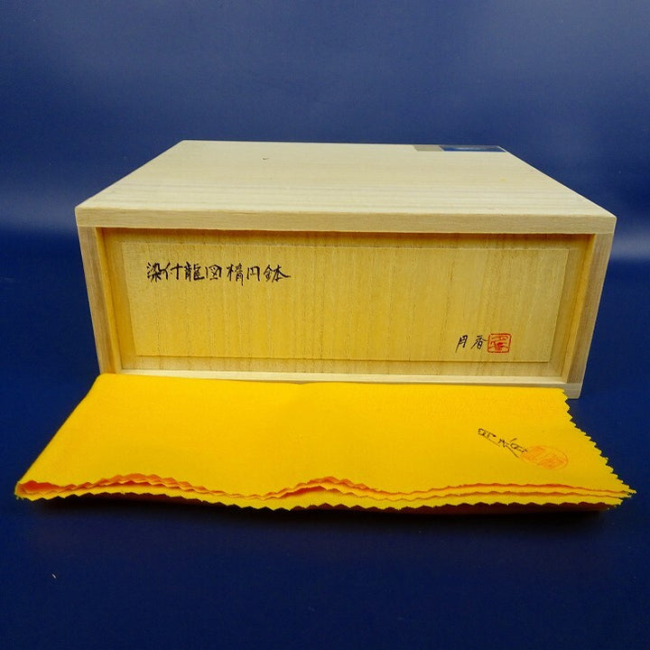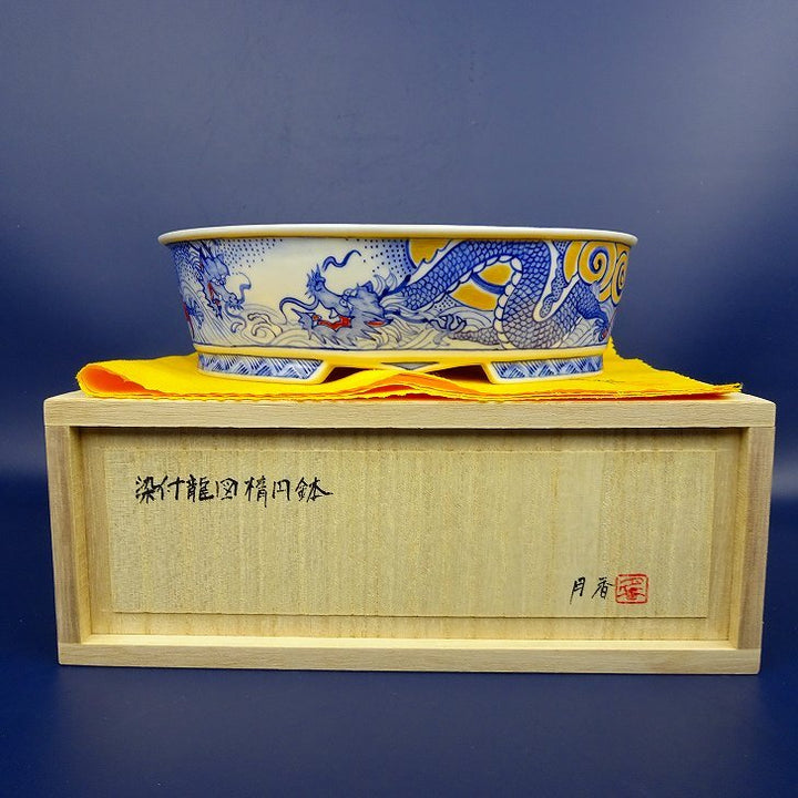 盆栽鉢 月香 小型 長辺 約18cm 楕円鉢 染付 龍 共布 共箱 観賞用 新品 e1198408796