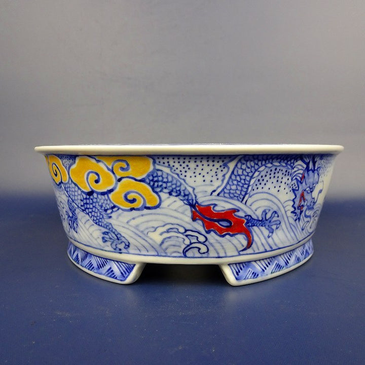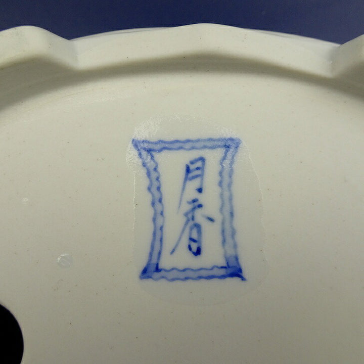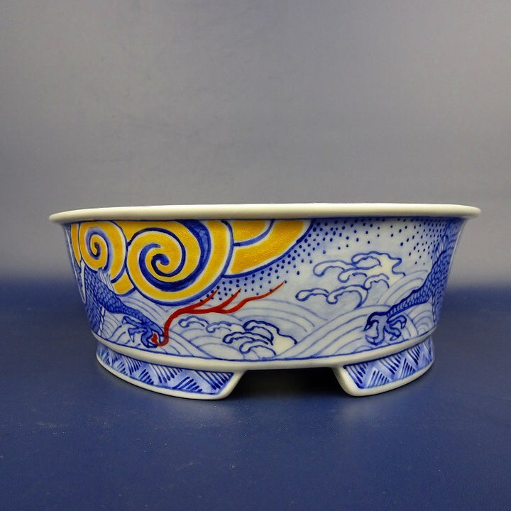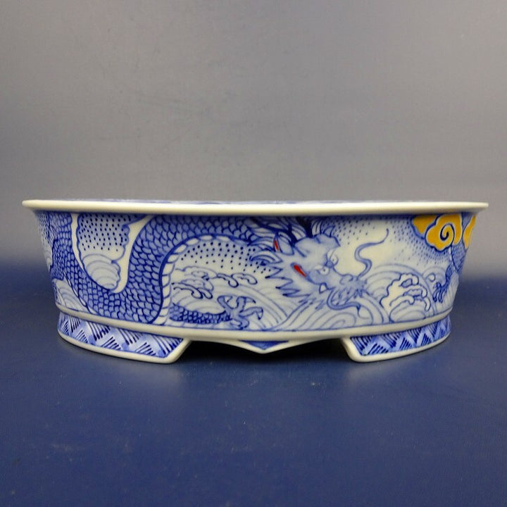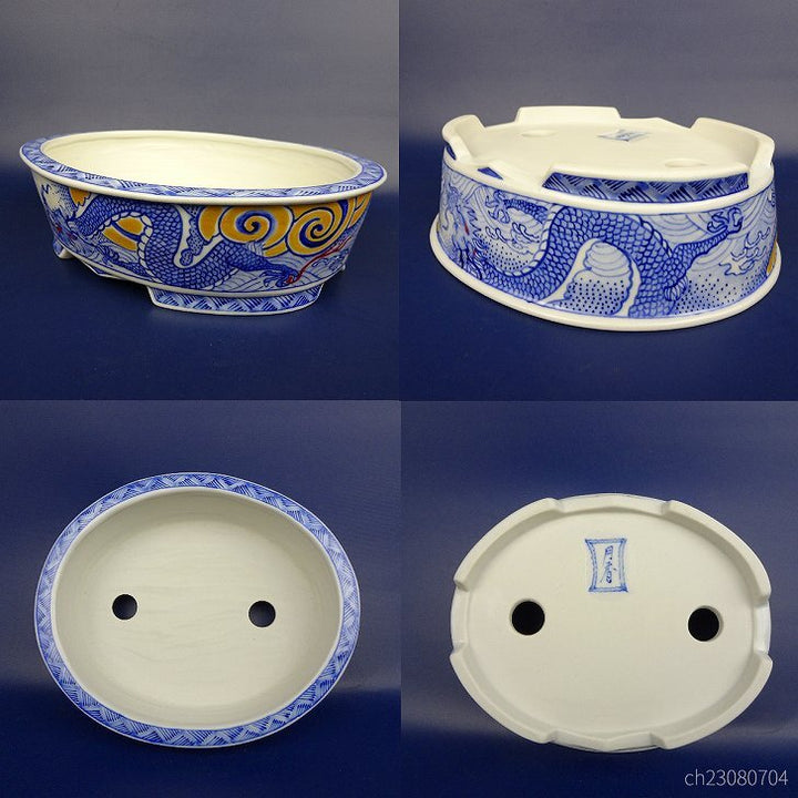 盆栽鉢 月香 小型 長辺 約18cm 楕円鉢 染付 龍 共布 共箱 現品 新品 本名  伊藤 寧俊 丹鏡窯四代目。昭和44年頃から染付鉢を作り始める。 名種展示会で最優秀作家賞,樹石社賞、近代出版社賞など流麗な筆致の染付、赤絵、色絵が高い評価を受け数多くの受賞歴があります。 絵は涌泉の影響が大きく、初期の細密に書き込む作風から徐々に線の太い省筆画に推移、色使いにも変化が見られ清潔感に満ちた筆致は月香どくとくです。型を用いない彫り抜き法がほとんどで...