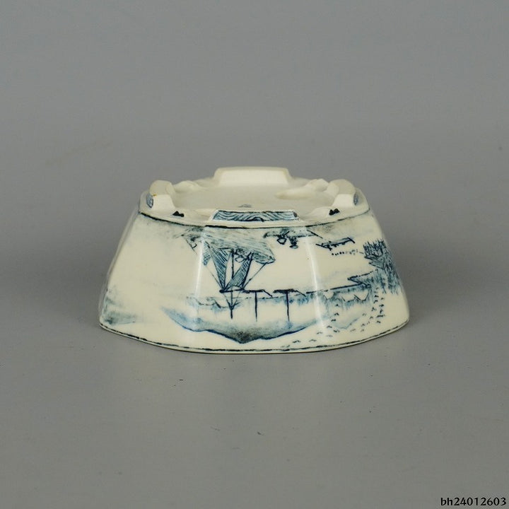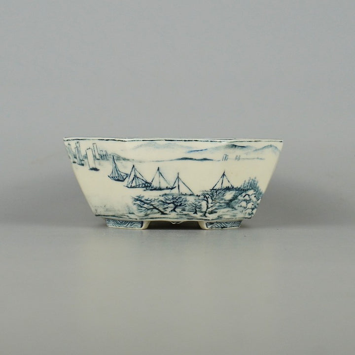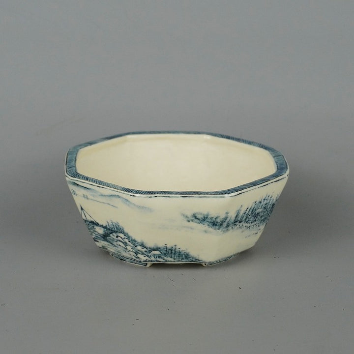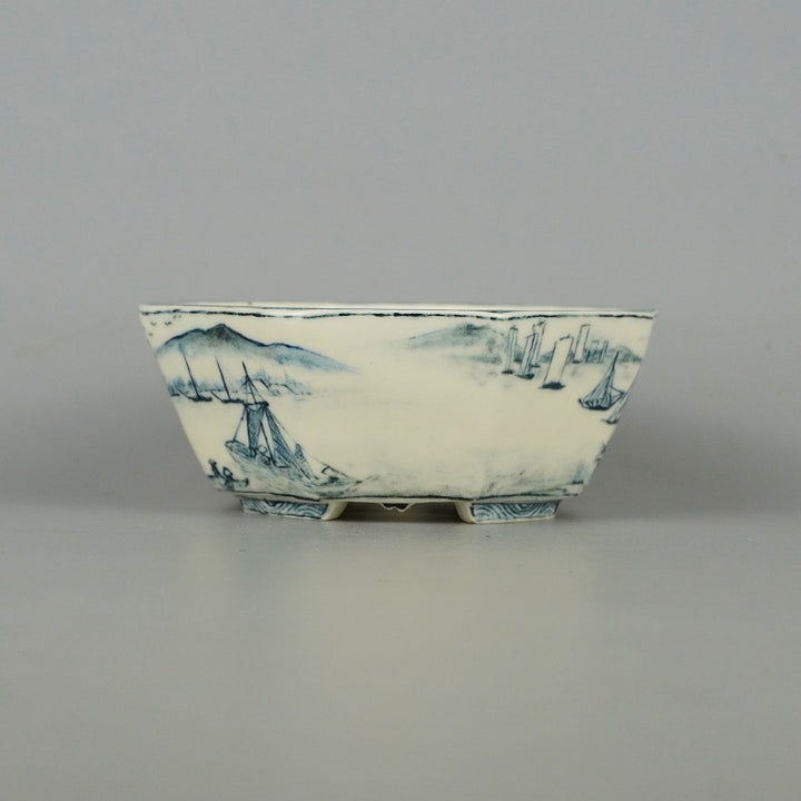 盆栽鉢 梢風 小型 長辺 約11cm 八角鉢 染付 山水図 舟 観賞用 新品 c1198412562