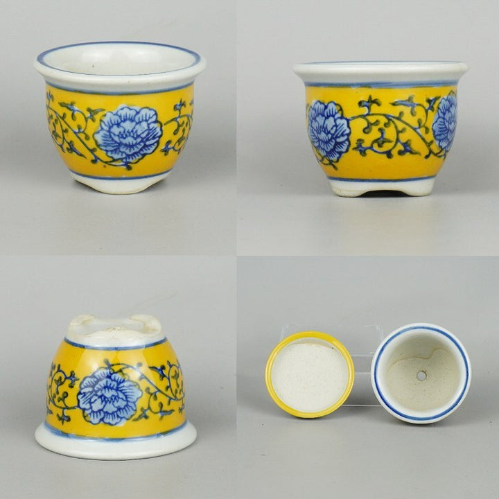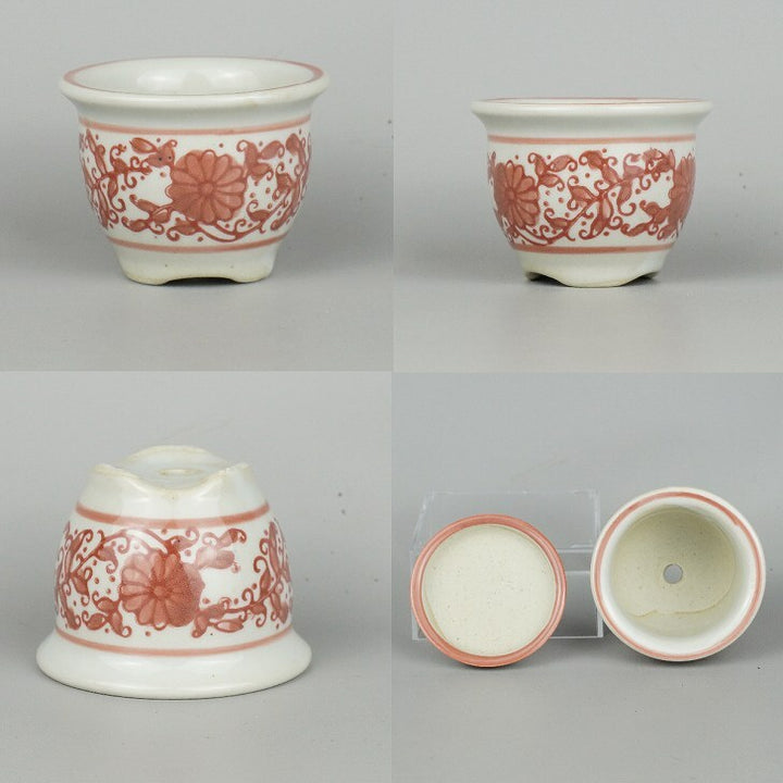 盆栽鉢 絵鉢 3点セット 小鉢 長辺 約7cm 丸鉢 花 赤 青 黄 受皿 落款なし 3鉢セット 数量物 新品 l1200308778