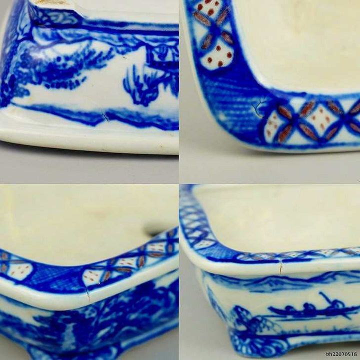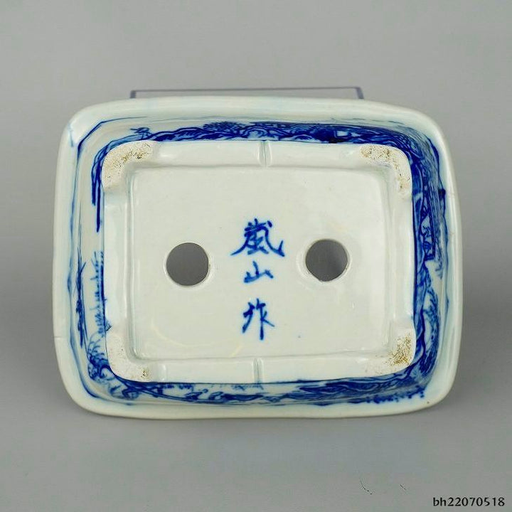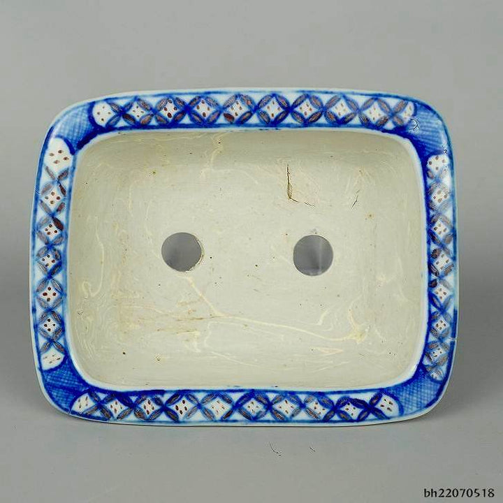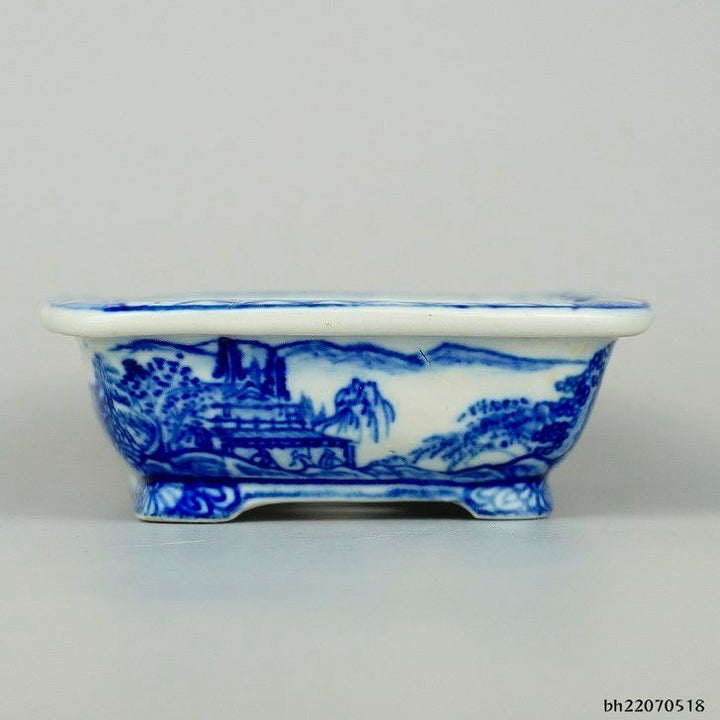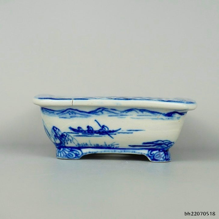 盆栽鉢 谷 嵐山 小型 長辺 約13cm 長方鉢 染付 山水図 外縁 撫角 中古鉢 e1198413966