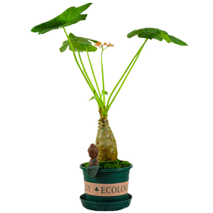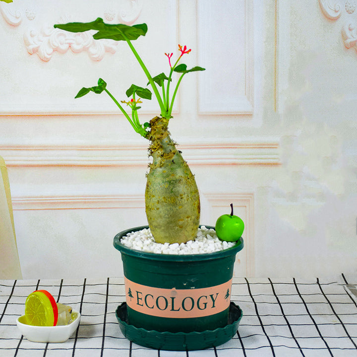 珊瑚油桐(Jatropha podagrica)是原產於中美洲的獨特多肉植物,最引人注目的是其膨大的基部塊莖,形似佛陀的肚子,因而得名。這款植物具有鮮明的熱帶特性:夏季為主要生長期,會長出大型掌狀葉片並開出鮮紅色的小花;冬季在低溫時會落葉休眠。栽培時需特別注意:生長期需充足光照和適量水分,休眠期則需減少澆水。其特殊的塊莖造型和鮮豔的花朵,使其成為多肉植物愛好者的珍稀收藏品種。