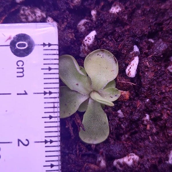 Pinguicula emarginata x hemiepiphytica is a hybird native to Mexico. Like other butterworts, it has sticky adhesive leaves. forms “drool edges” which attract, capture and digest arthropod prey in order to supply the plant with nutrients such as nitrogen not found in the nutrient poor, acidic soil that it grows in. There are tiny hairs on the leaves.
