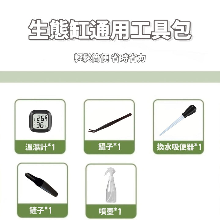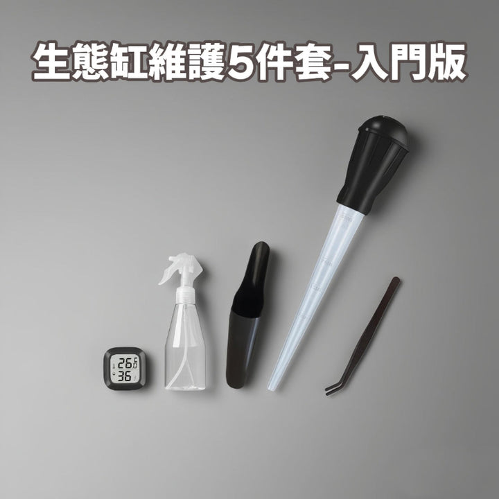 生態缸維護總5件套有:溫濕計、噴壺(200ml)、鏟子、換水吸便器、鑷子