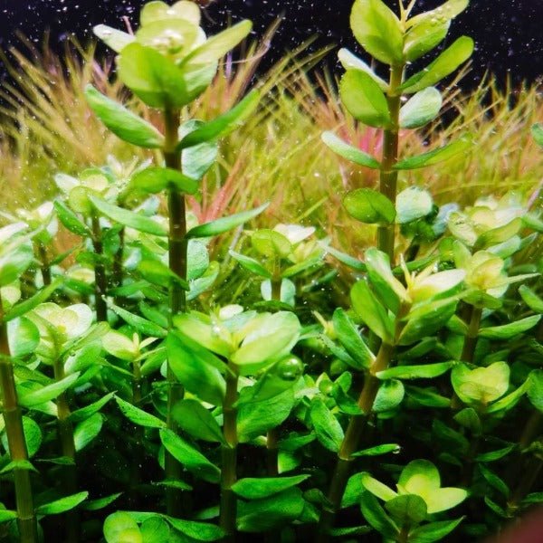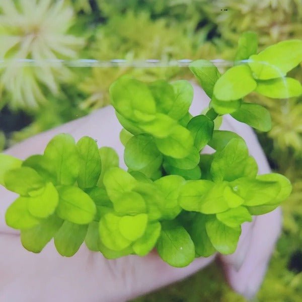 印度小圆叶是一种经典的中景水草,因其适应性强、生长快速而深受水族爱好者喜爱。它的叶片小巧圆润,呈青绿色至淡橙色,在强光下色彩更加鲜明。适合种植于22-30°C的水温环境,对光照要求中等至强光,CO₂非必需但能促进茂密生长。印度小圆叶适合密植,定期修剪可保持紧凑株型,并促进侧芽萌发,形成浓密的丛生效果。它既能单独成景,也能与红草搭配增强色彩对比,是水草造景中百搭又易养的优秀选择,特别推荐给新手和进阶玩家。