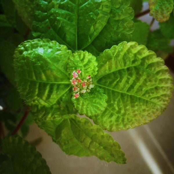 “Moon Valley” has large deeply textured leaves.The leaves are chocolate brown in the center with a wide margin of lime green. In more shade the leaves have more lime green in them. Leaf undersides are typically dark red. Tiny pink-green flowers in branched cymes in summer are not particularly showy. This pilea has a really dramatic appearance. It is perfect for the window sill, mixed container or large terrarium.