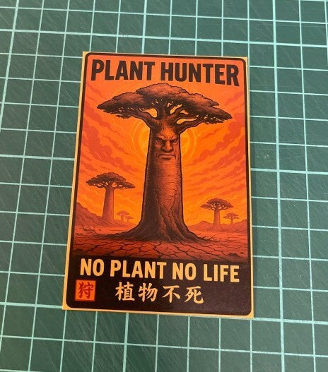 PLANT HUNTER LAB オリジナルステッカーシリーズ。「NO PLANT NO LIFE」第四章——根之王者(BAOBAB MONARCH)。大地に立つ一本の巨樹。それはアフリカ原産の大猴包樹をモチーフにした、生命と再生の象徴。荒野にそびえる姿は、静けさの中に圧倒的な存在感を放ち、ブランドの根源的理念「植物不死」を体現しています。PLANT HUNTER世界観の中では「根の王者」として登場し、全ての塊根植物・多肉植物の祖霊的存在を表現してい...