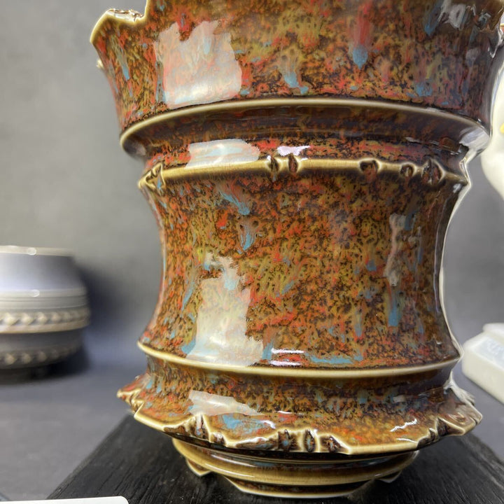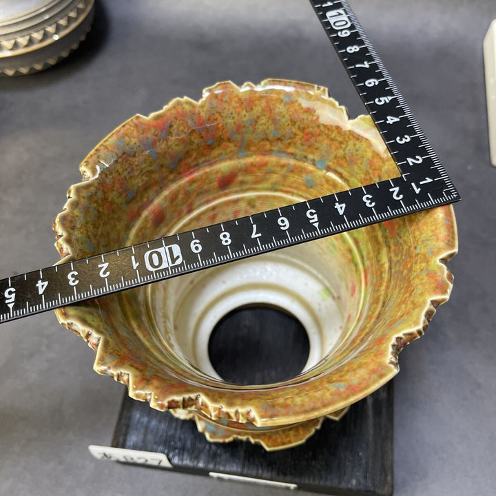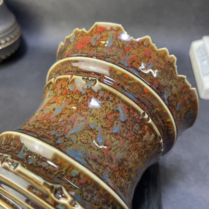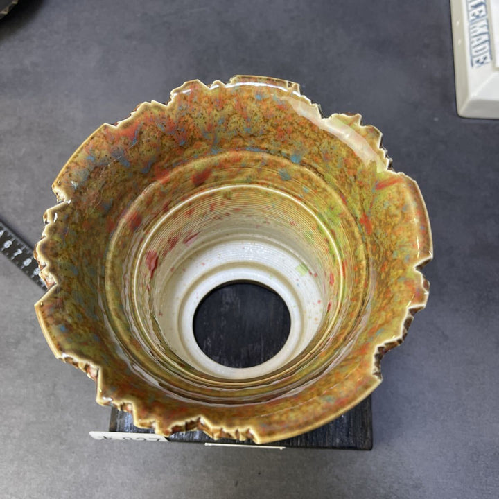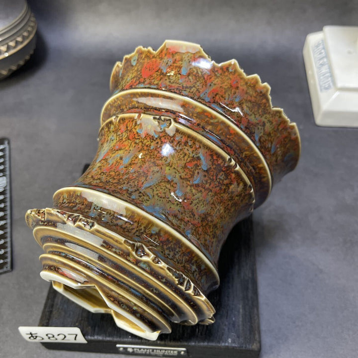 【作品名】火成彩殻・多層鉱脈モデル 火山岩が長い時間をかけて風化し、 表層の鉱物がにじみ出るような多層の釉表が特徴の一点。 黄土・赭赤・焦茶が複雑に混ざり合う中、 銅系の青い結晶が散りばめられ、 まるで地中の鉱脈が割れ目から姿を現したかのような表情を見せます。 破れた花冠のような口縁、...