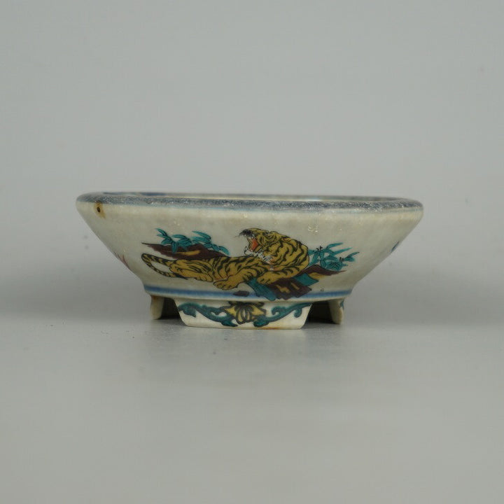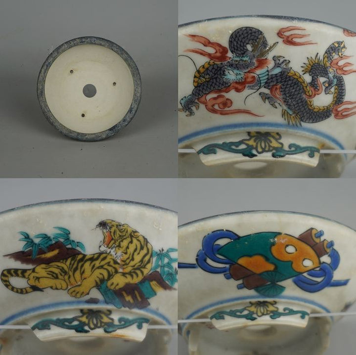 盆栽鉢 九谷 小型 長辺 約 10cm 丸鉢 色絵 龍 虎 リュウ トラ 観賞用 現品 中古鉢 品名九谷...
