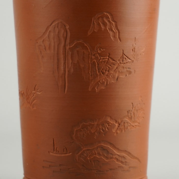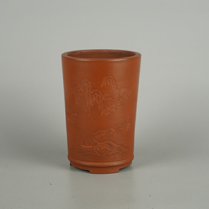 中古盆栽鉢 常滑 泥珠 小型 高さ 約 11.6cm 下方 丸鉢 彫入 山水図 泥物 鑑賞 観賞用 中古鉢 j1209298254