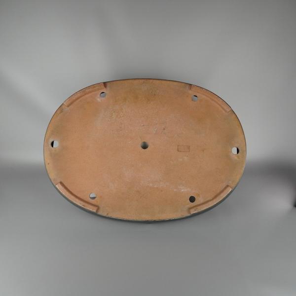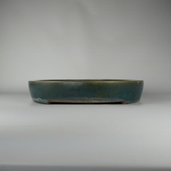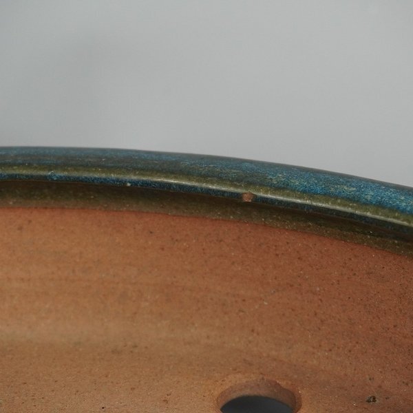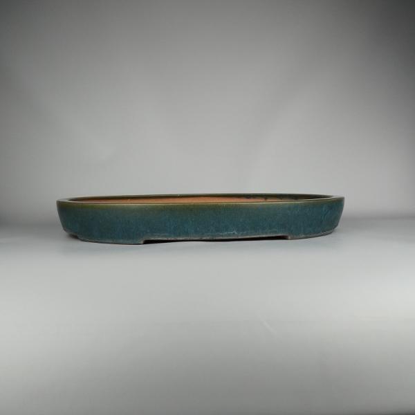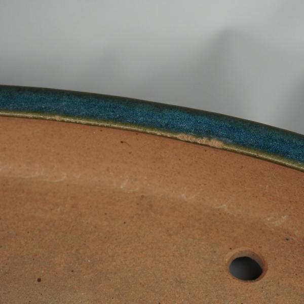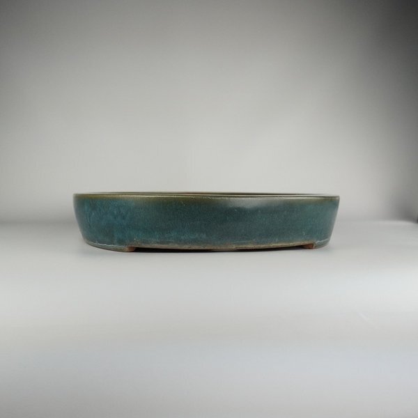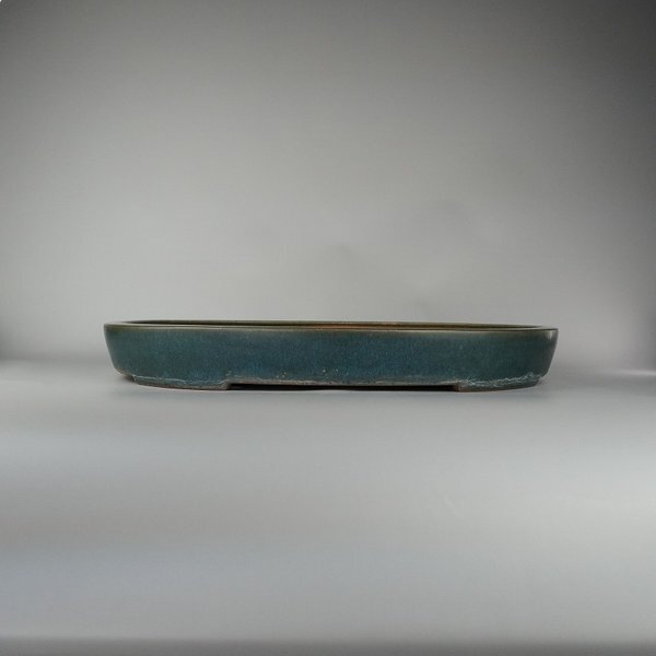 盆栽鉢 常滑 黎鳳造 長辺 約53cm 楕円鉢 釉薬 現品 中古鉢 本名 片岡勝資 常滑では焼締陶が主体で釉色主体として制作する人が少ない中、主として釉色樹鉢や釉色水盤をつくる。中国古渡り、中渡りの白交趾、均釉再現に努め若くして定評を得る。 現在は常滑のみならず日本を代表する釉色盆器の作り手の一人である。 近年は南蛮風の焼締陶を手掛け、部分的に灰釉のかかったものなど、程よい味わいの南蛮風で人気がある。...