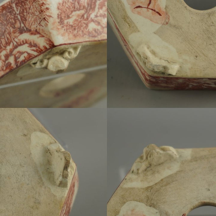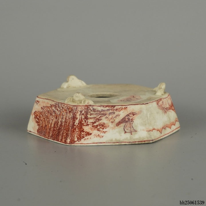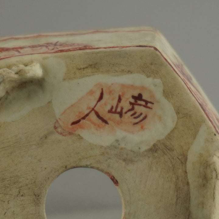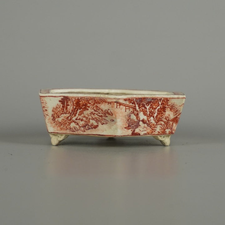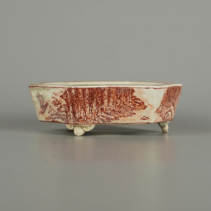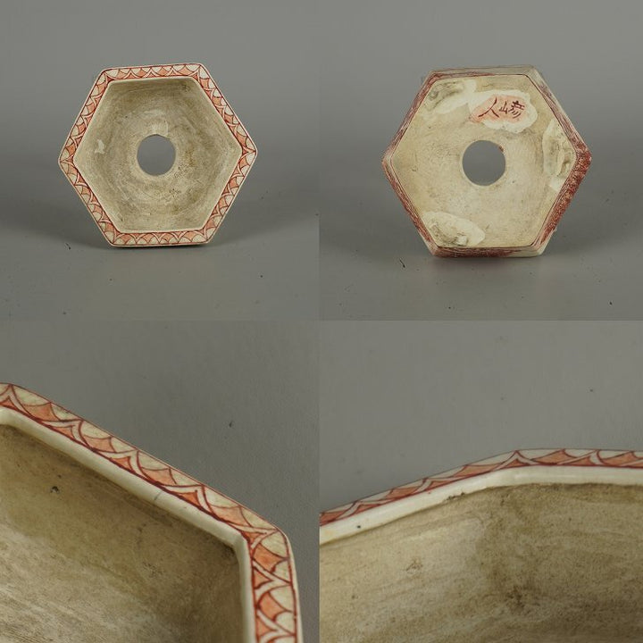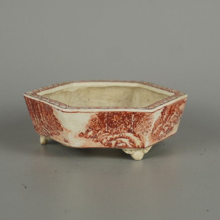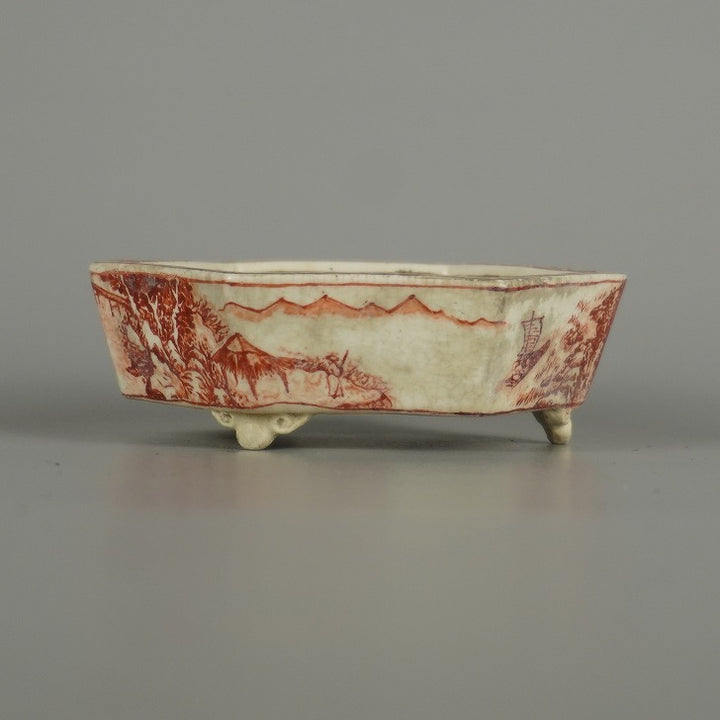 盆栽鉢 彦山人 小鉢 長辺 約 9.8cm 六角鉢 雲足 赤絵 山水図 鑑賞 観賞用 現品 中古鉢 品名彦山人...