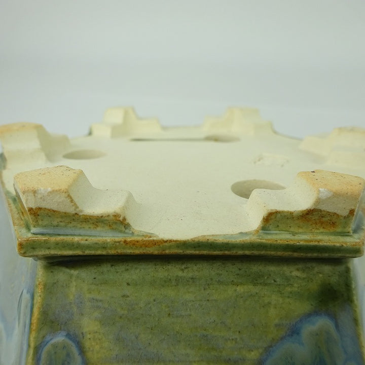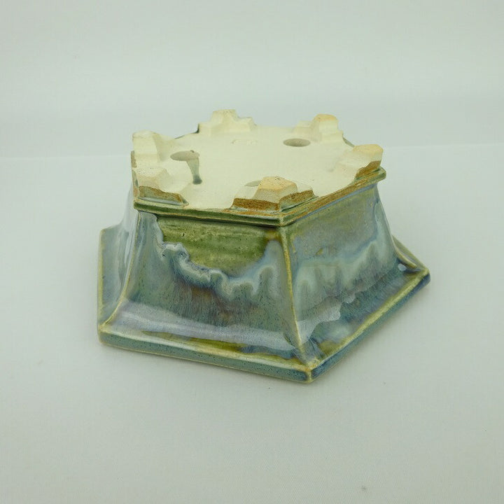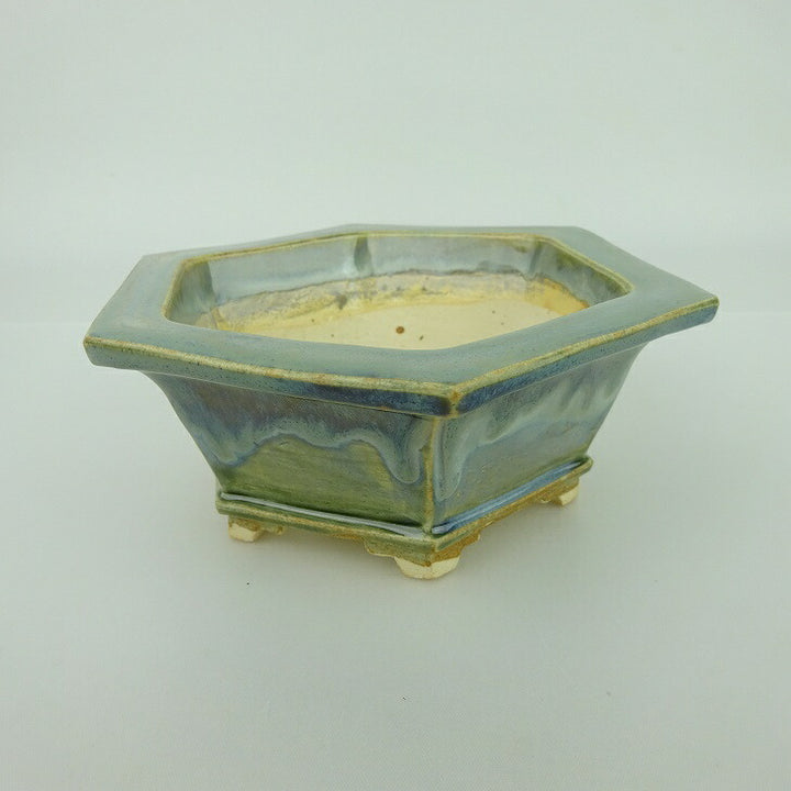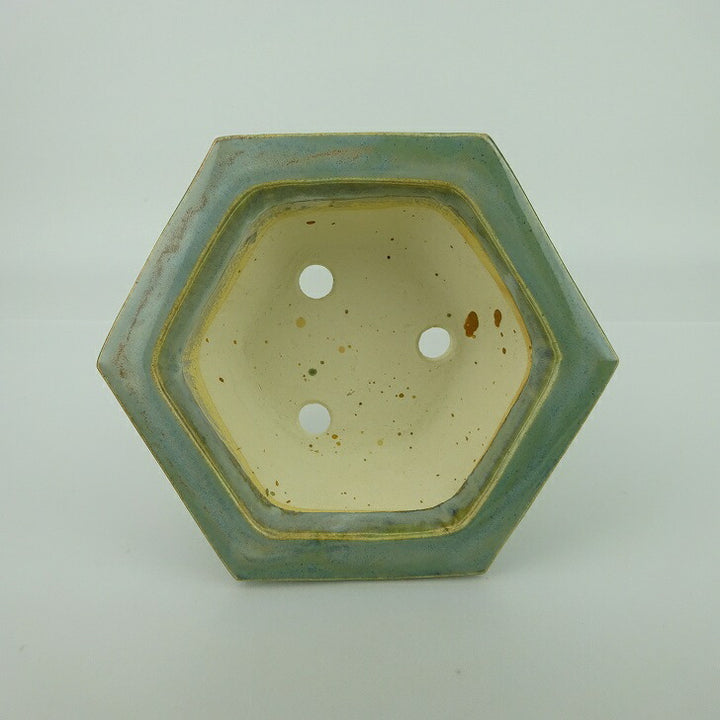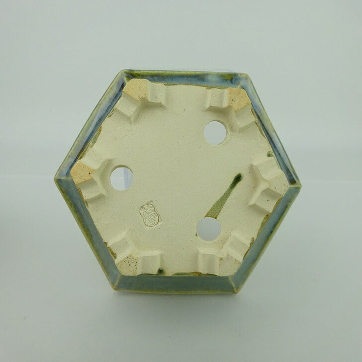 【中古】盆栽鉢 桂雲 福田桂雲 小型 長辺 約 15cm 六角鉢 外縁 下帯 釉薬 観賞用 現品 中古鉢 桂雲 本名:福田康男 センスの良さで品質の高い釉薬鉢を作られる。 2020年 雅風展併催の現代小鉢作家展釉薬の部において金賞受賞 現代釉薬鉢作りの第一人者の福田茂氏が甥にあたり、茂氏主催の福田工房陶芸教室で学ばれる。 もともと盆栽愛好家であることから使い勝手の良い型、多彩な釉薬が特徴の鉢を手掛けられる。...