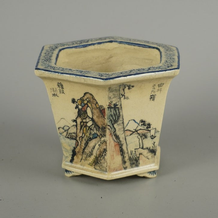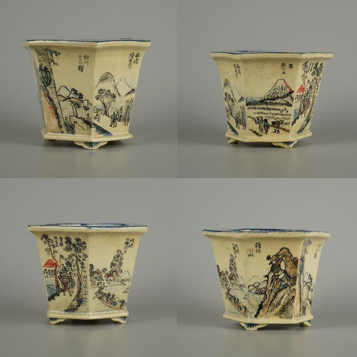 中古盆栽鉢 武州庵 福茂 小型 長辺 約 7.3cm 六角鉢 色絵 東海道 五拾三次 模様 共箱 共布 鑑賞 観賞用 中古鉢 r1207533377