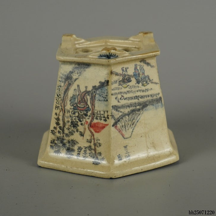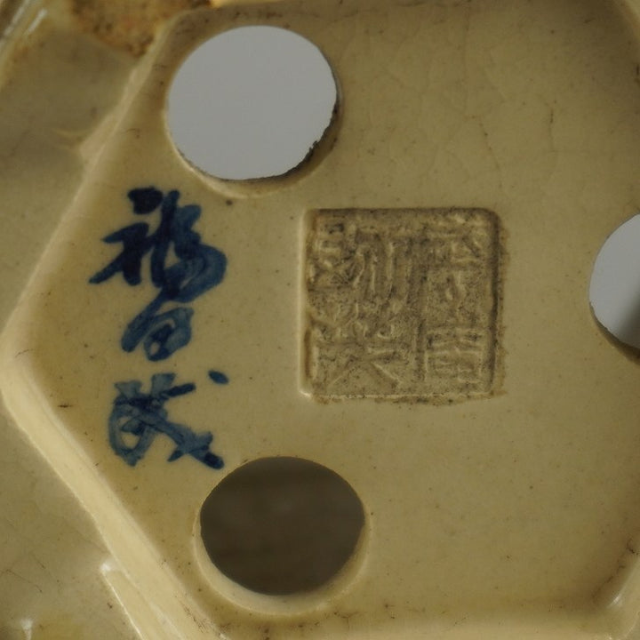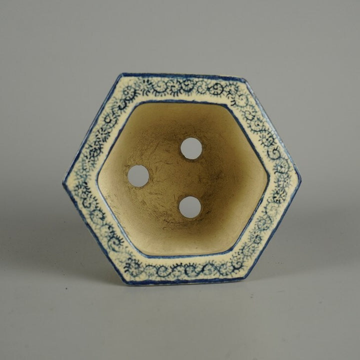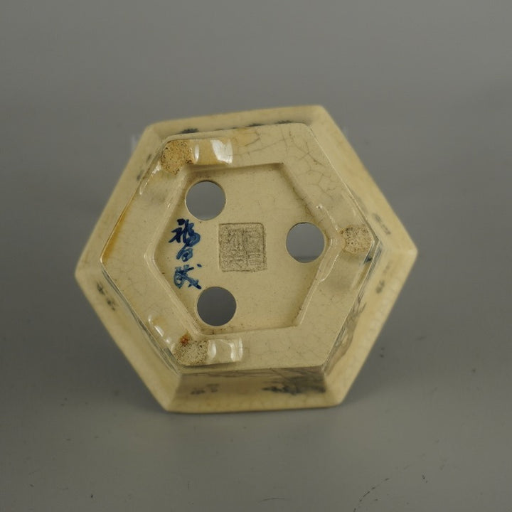 盆栽鉢 武州庵 福茂 小型 長辺 約 7.3cm 六角鉢 色絵 東海道 五拾三次 模様 共箱 共布 現品 中古鉢 品名武州庵 福茂(共箱・共布)...