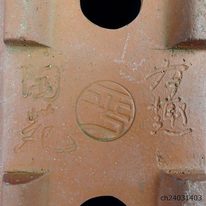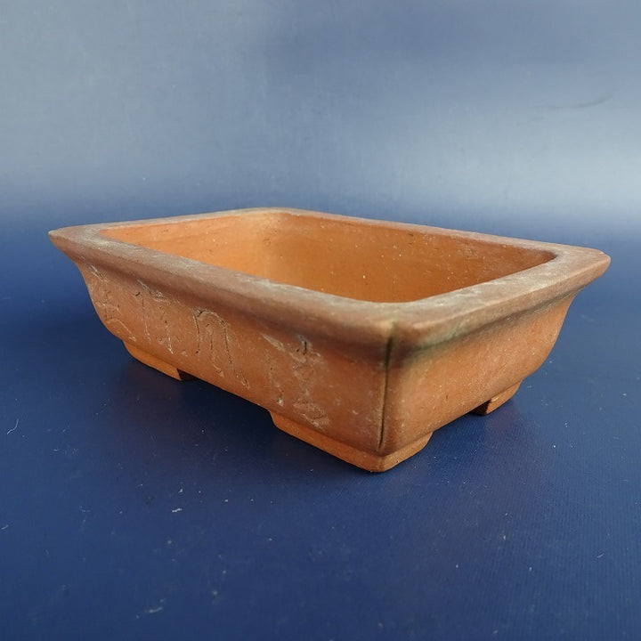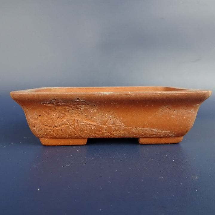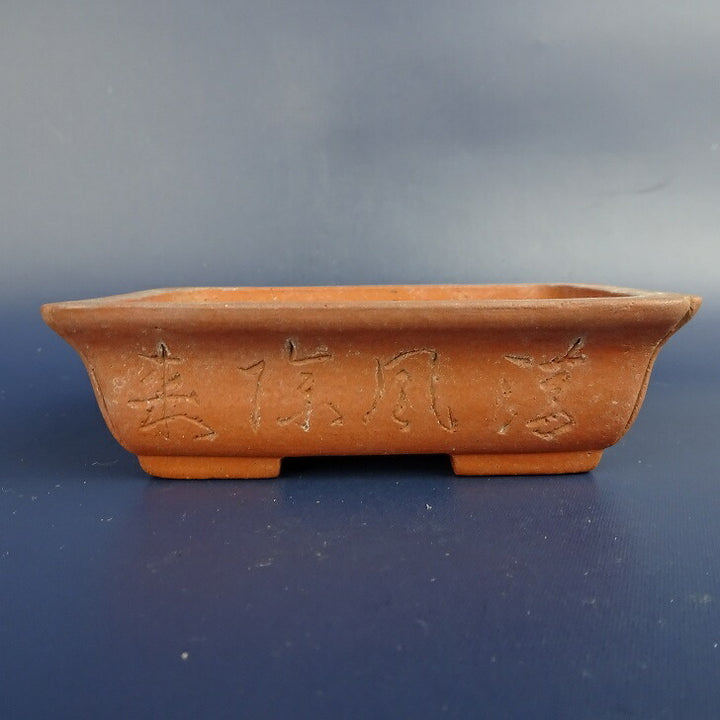 中古盆栽鉢 萬留平 小型 長辺 約10.3cm 長方鉢 隅入 彫入 山水図 文字 泥物 観賞用 中古鉢 s1198418254