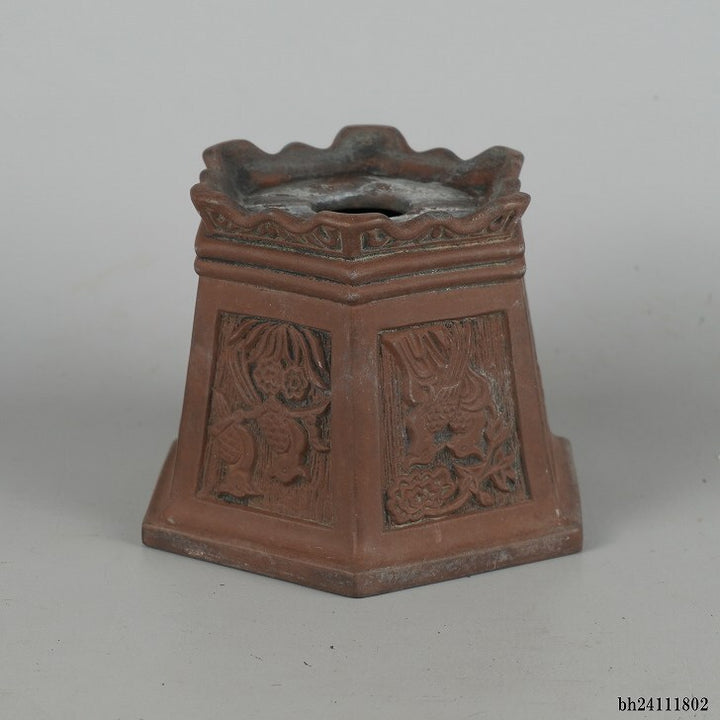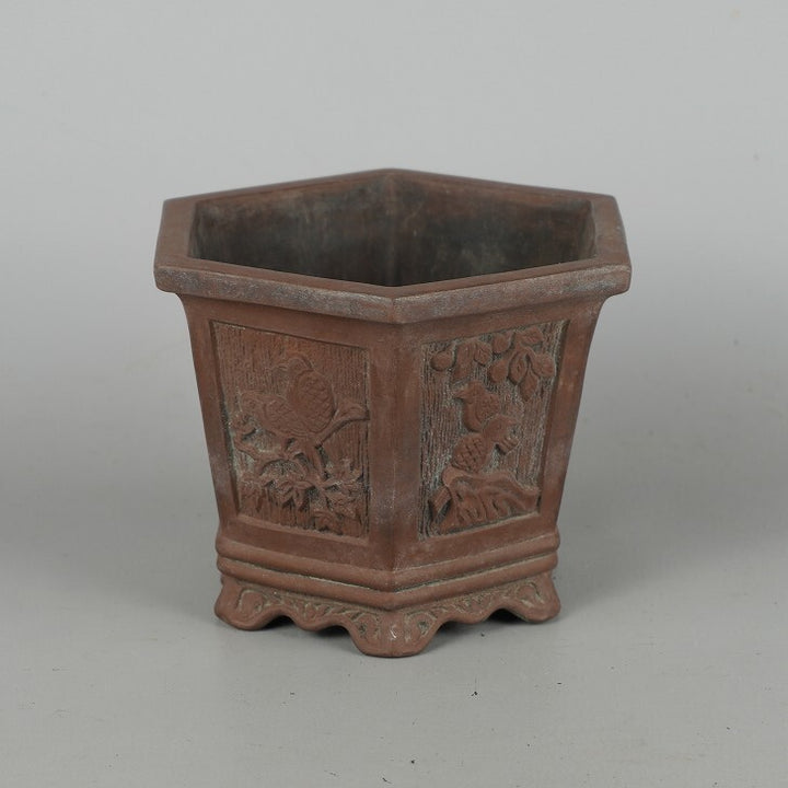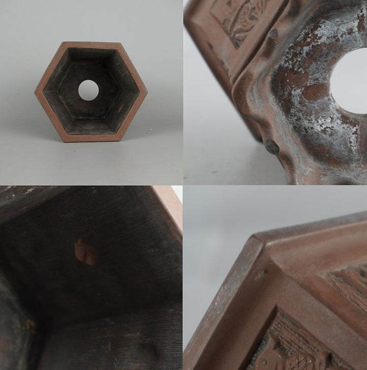 中古盆栽鉢 落款あり 小型 長辺 約13.8cm 六角鉢 外縁 窓付 鳥 花 泥物 中古鉢 1198401839