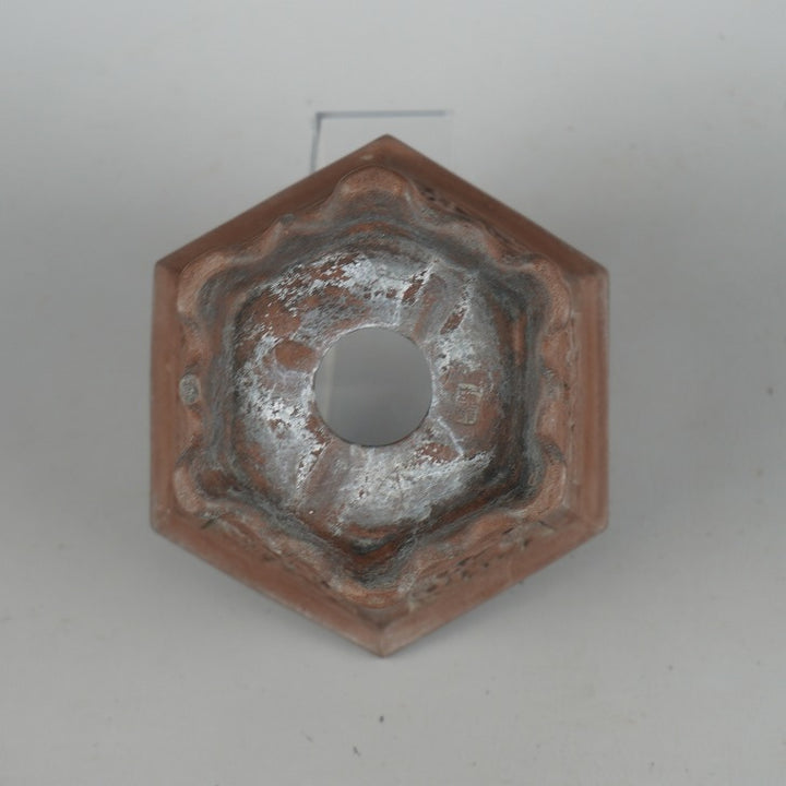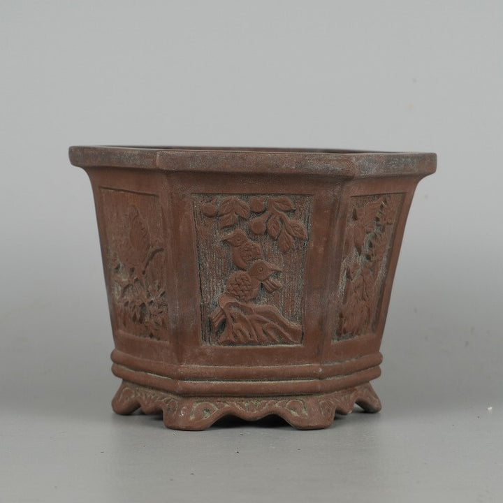 盆栽鉢 落款あり 小型 長辺 約13.8cm 六角鉢 外縁 窓付 鳥 花 泥物 現品 中古鉢 品名落款あり...