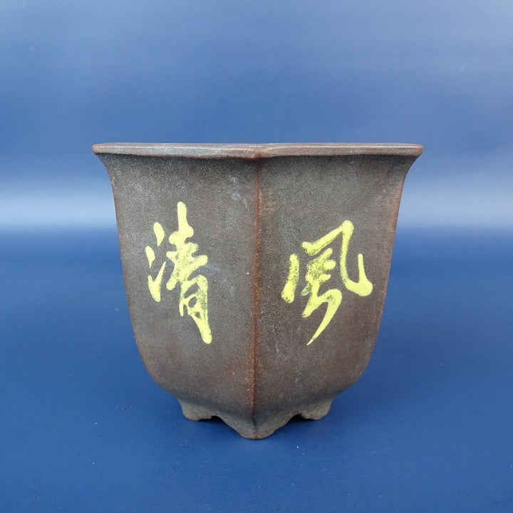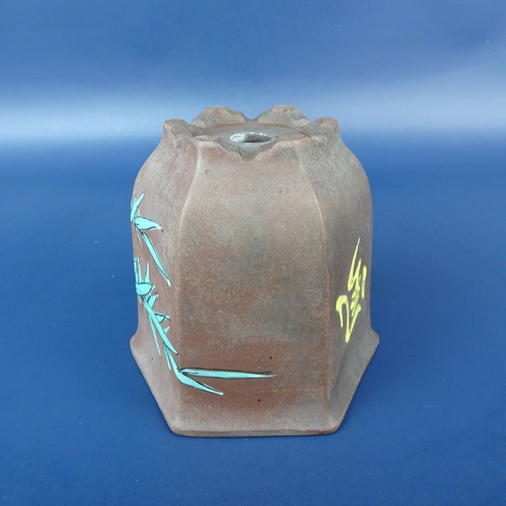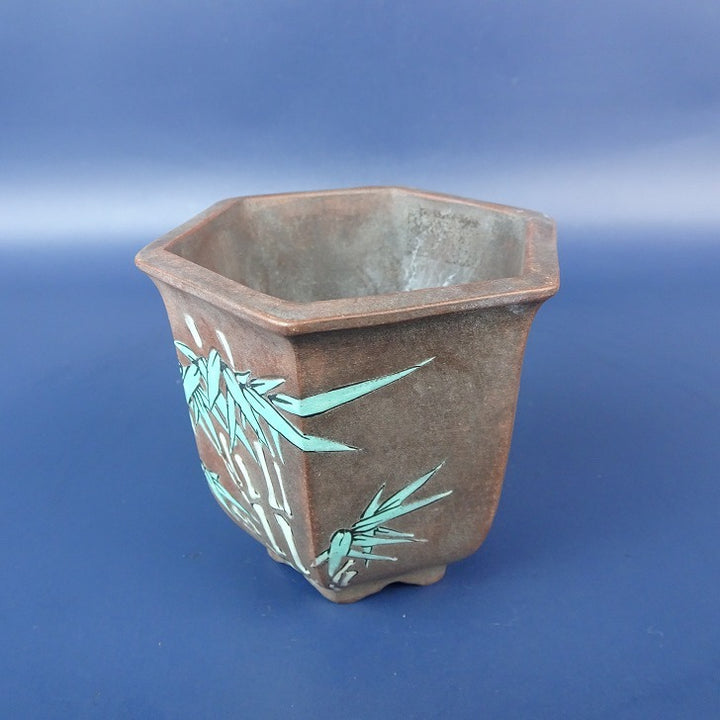 中古盆栽鉢 落款あり 小鉢 長辺 約8.7cm 六角鉢 外縁 色絵 笹 竹 泥鉢 中古鉢 r1198403745