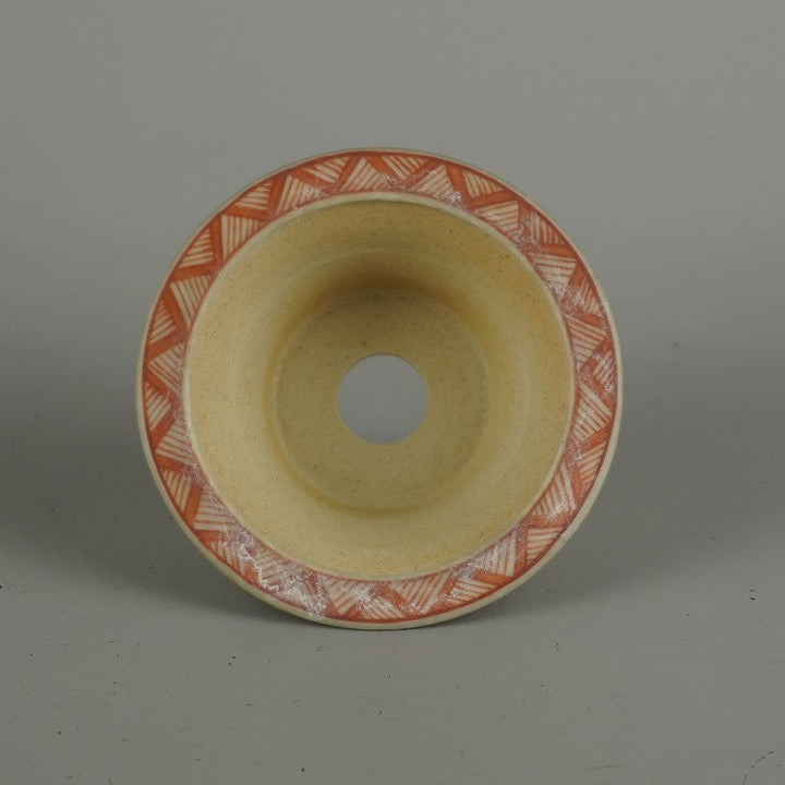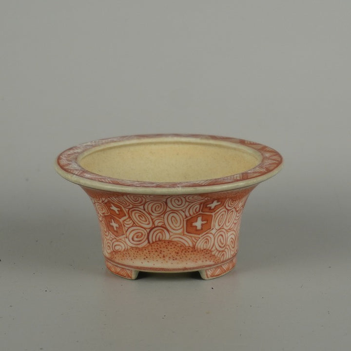 中古盆栽鉢 落款なし 小型 長辺 約 10cm 丸鉢 外縁 赤絵 模様 鑑賞 観賞用 中古鉢 1212035143