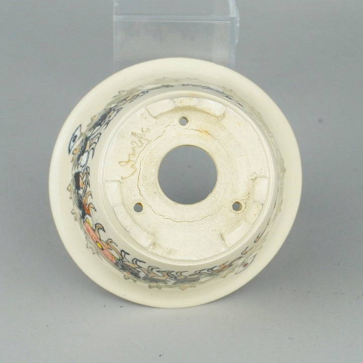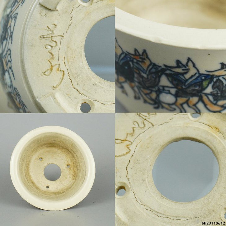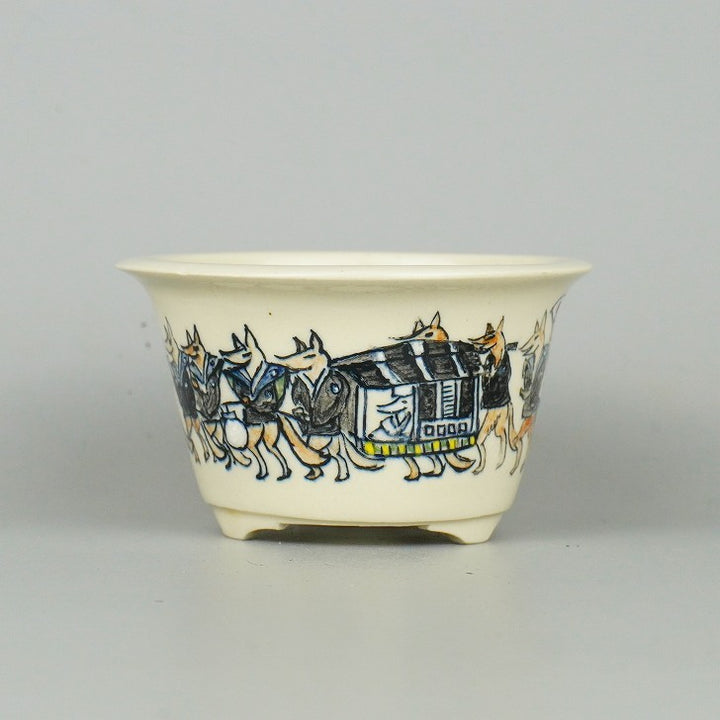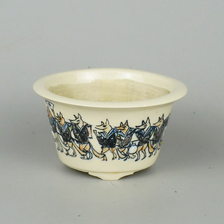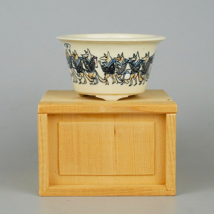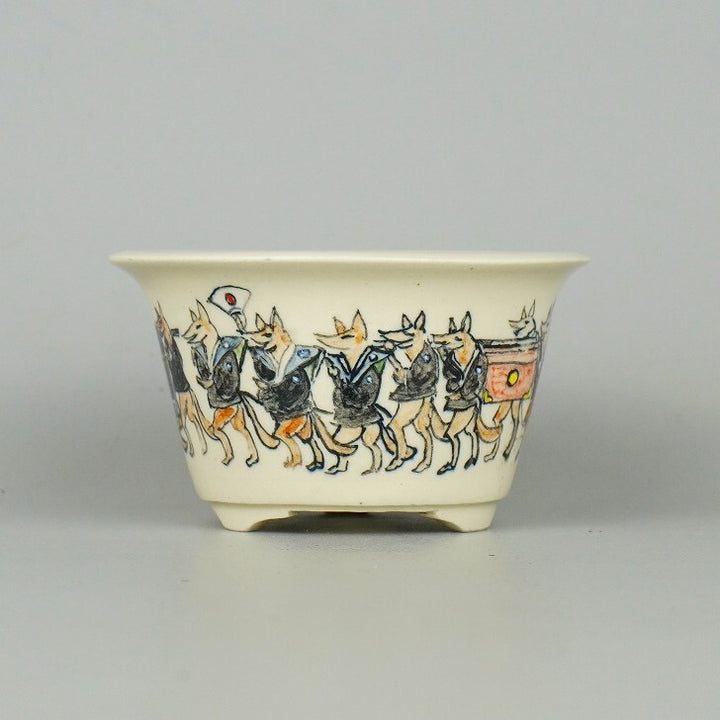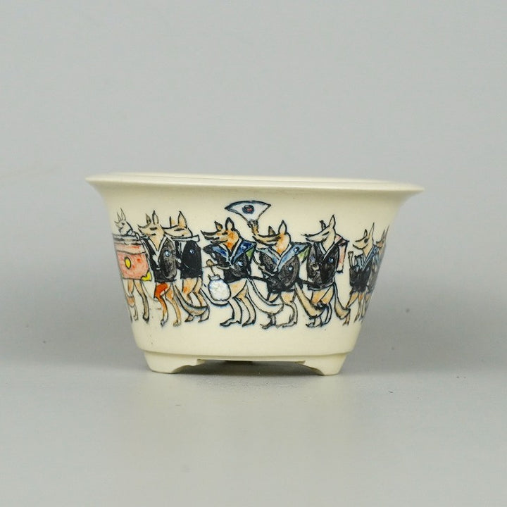 中古盆栽鉢 越前芳水 小鉢 長辺 約8cm 丸鉢 色絵 狐の嫁入り図 箱付 観賞用 中古鉢 x1198411287