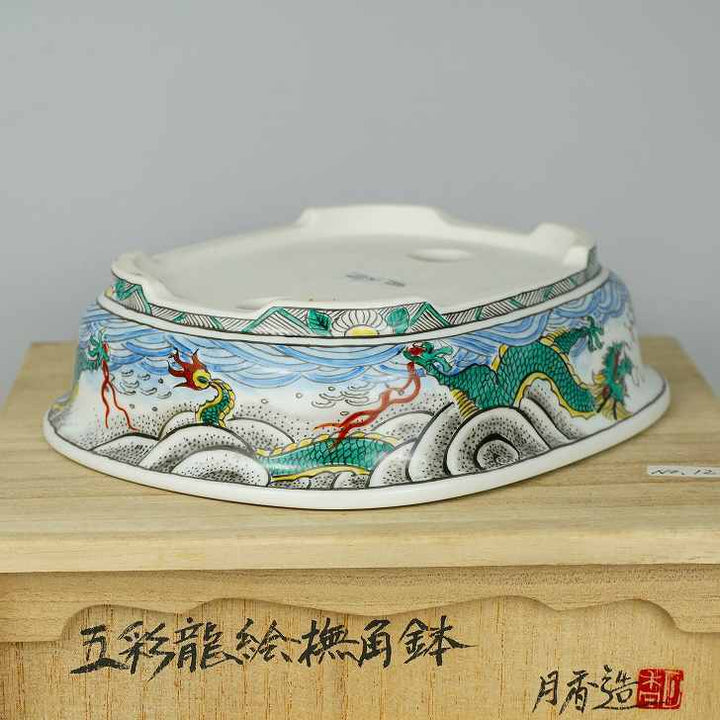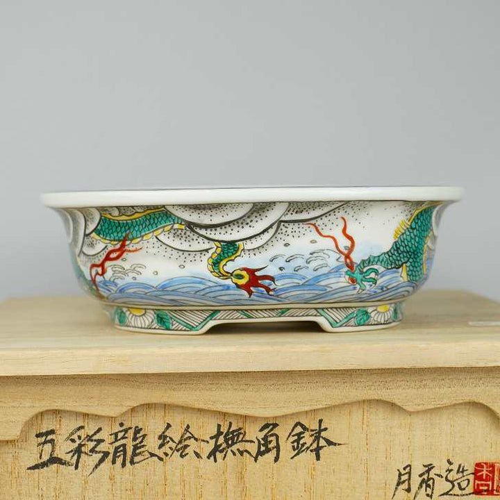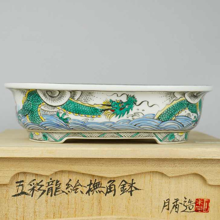 月香 共布 共箱 五彩 龍絵 撫角 長方鉢 観賞用 盆栽鉢 新品 s1198414366
