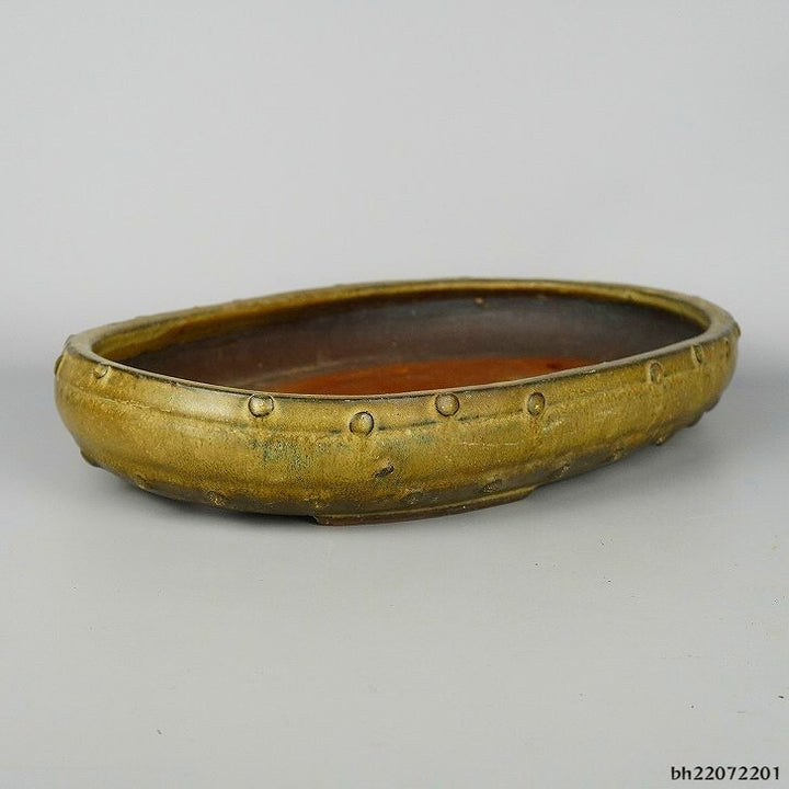 盆栽鉢 三州 一陽 中型 長辺 約34cm 楕円鉢 太鼓 鋲打 釉薬 現品 中古鉢 商 品 名三州一陽 サ イ ズ高さ 約5センチ...