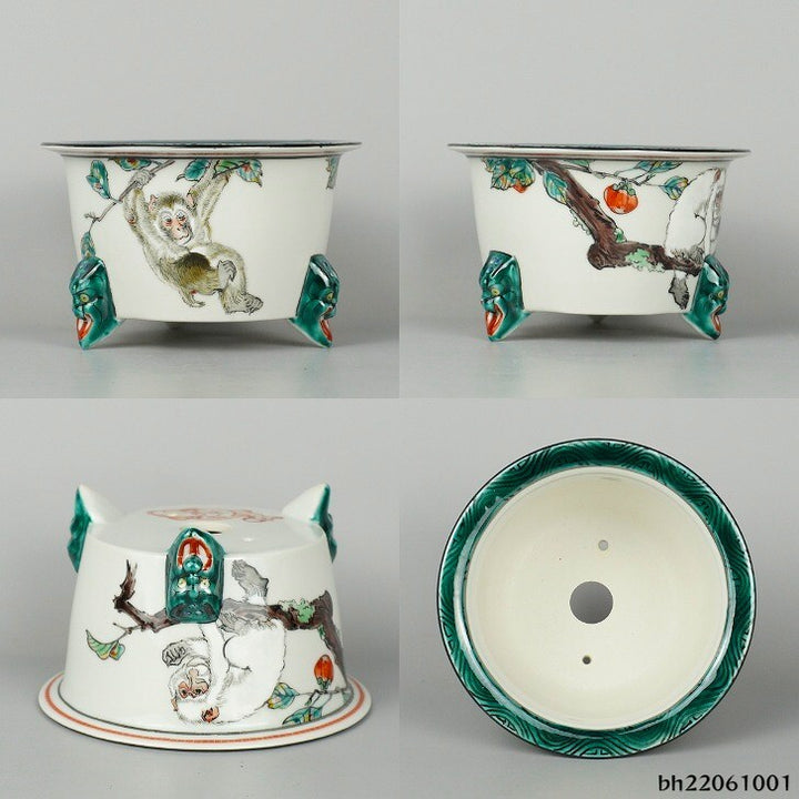 盆栽鉢 九谷 一向 小型 長辺 約 12cm 丸鉢 鬼面足 色絵 白猿図 共箱 共布 観賞用 新品 p1198417833
