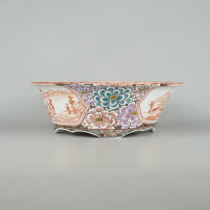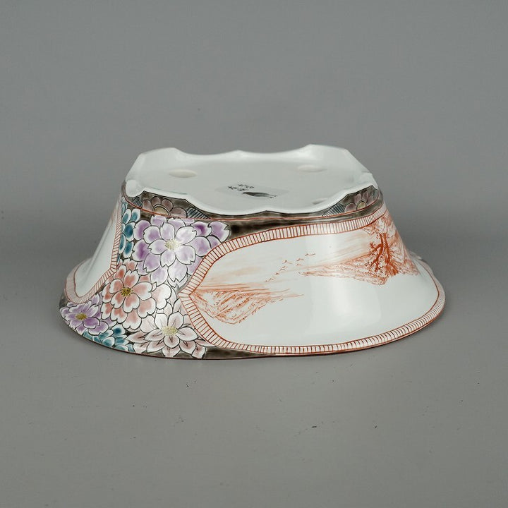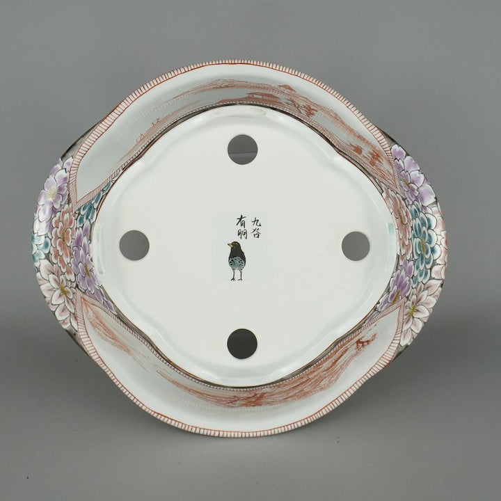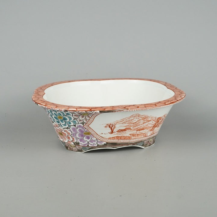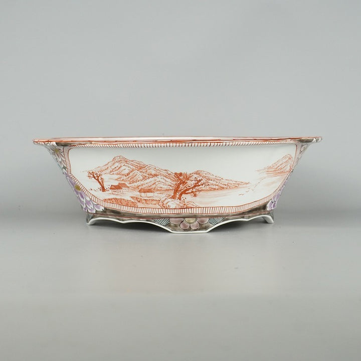 盆栽鉢 九谷 有朋 中型 長辺 約 24.3cm 木瓜鉢 赤絵 花詰 窓抜 山水図 共布 共箱 観賞用 新品 r1198405332
