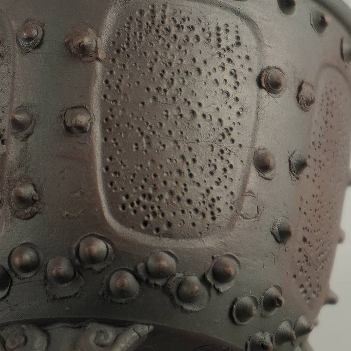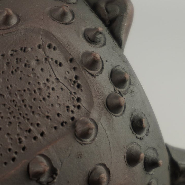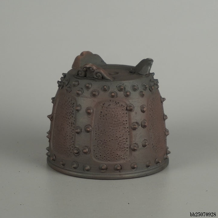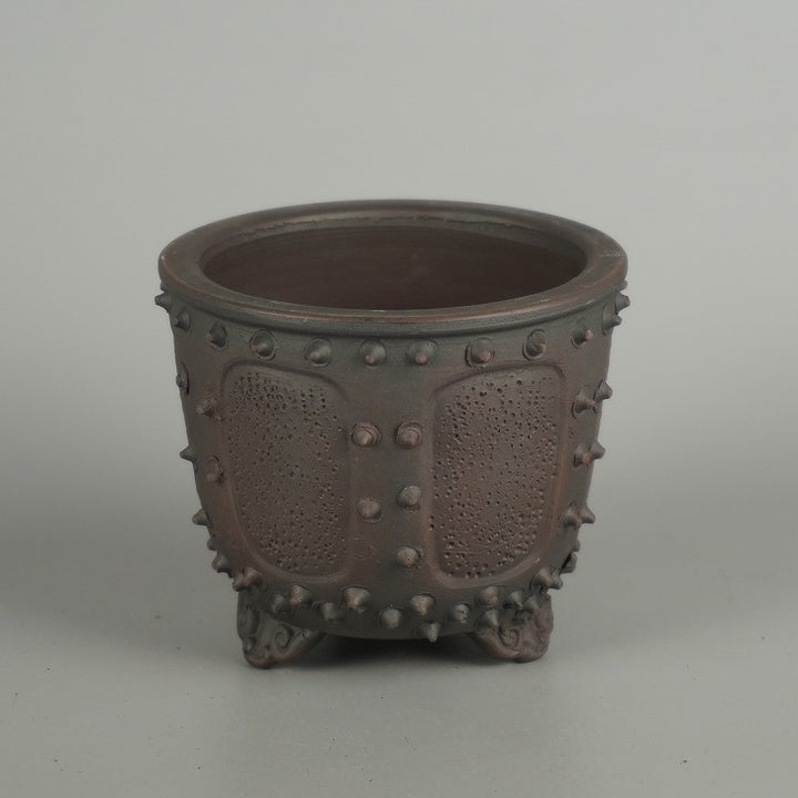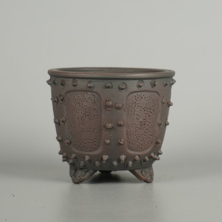 盆栽鉢 常滑 美芸 小鉢 長辺 約 9cm 丸鉢 雲足 窓入 鋲打 泥物 鑑賞 観賞用 現品 美芸 朱泥ボカシの小鉢が有名で泥物を専門としている。作品はシンプルな形や模様のものが多く、小鉢から30cm前後の大きな鉢も制作する。形も正方形、長角、六角、八角、丸など多彩である。 釘彫り、透彫り、象眼などの装飾を加えた細工物も手掛ける。...