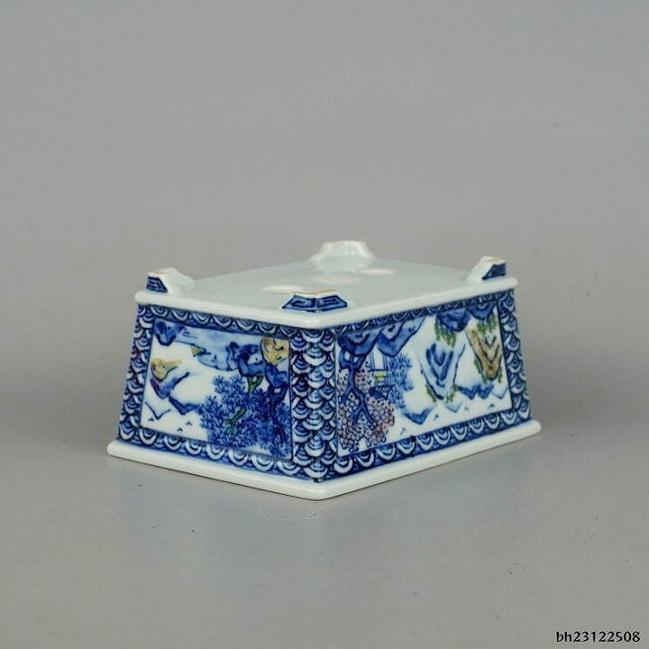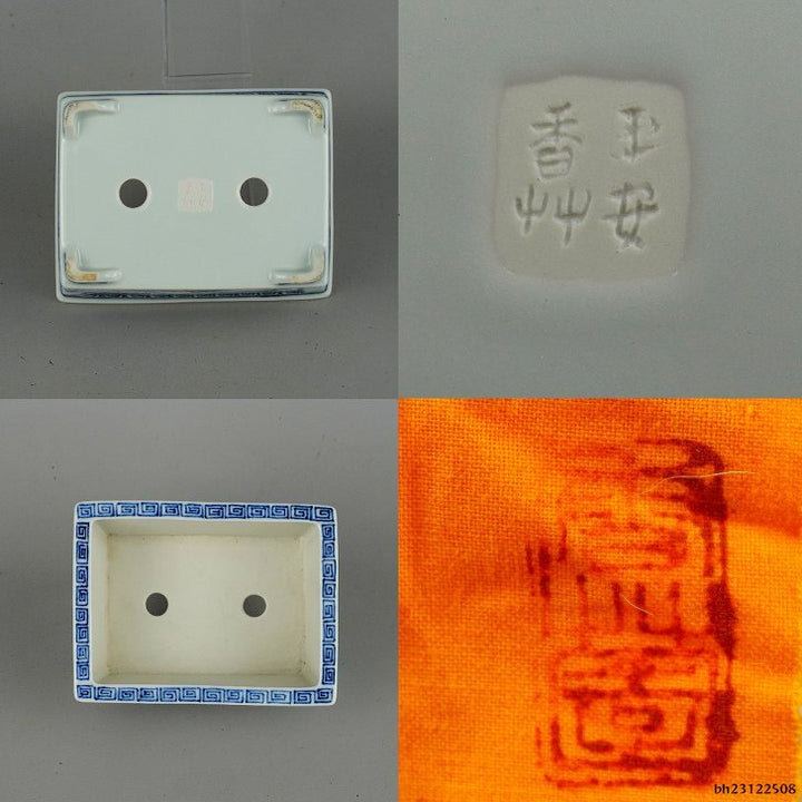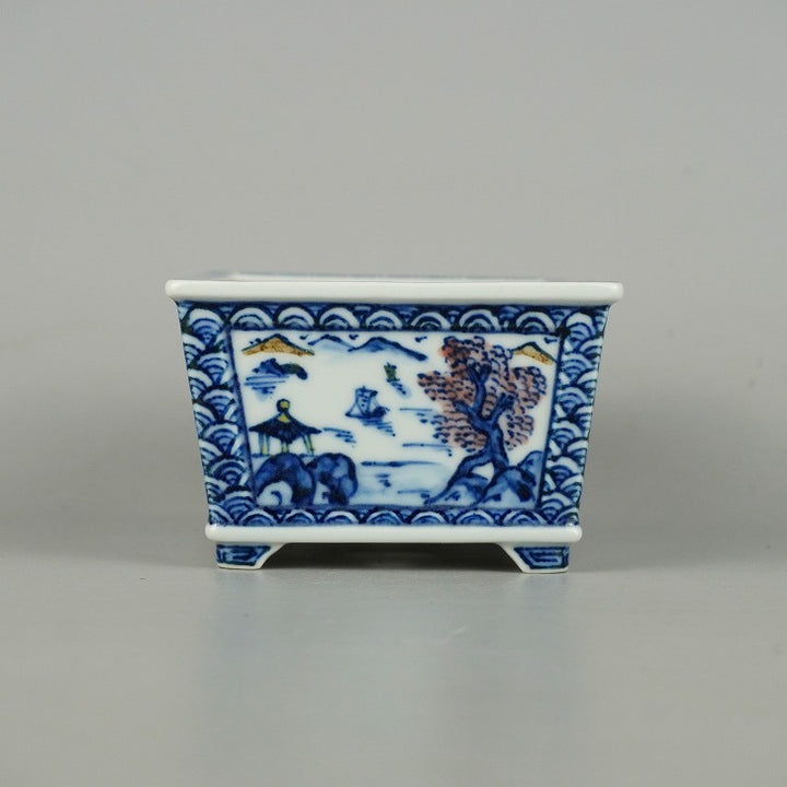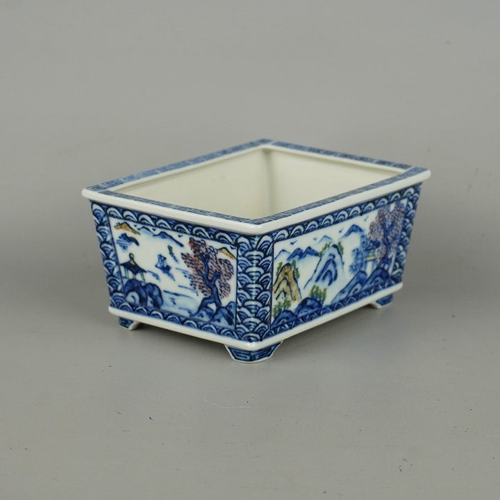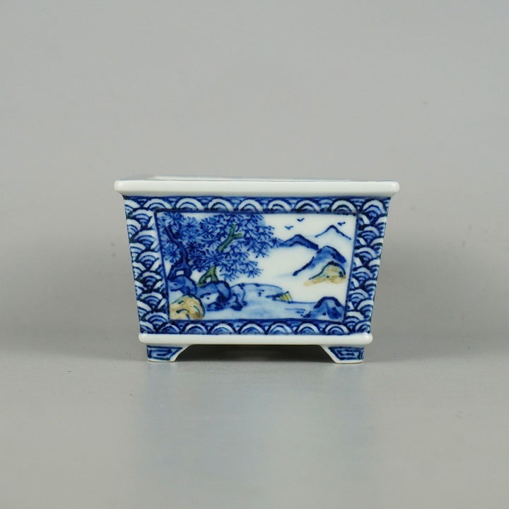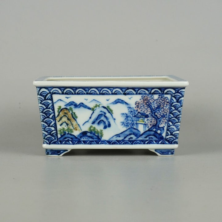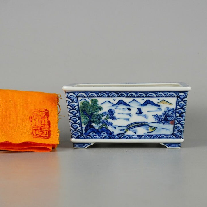 盆栽鉢 平安 香草 小型 長辺 約12.3cm 長方鉢 窓付 色絵 山水図 染付 模様 共布 観賞用 新品 o1198428056