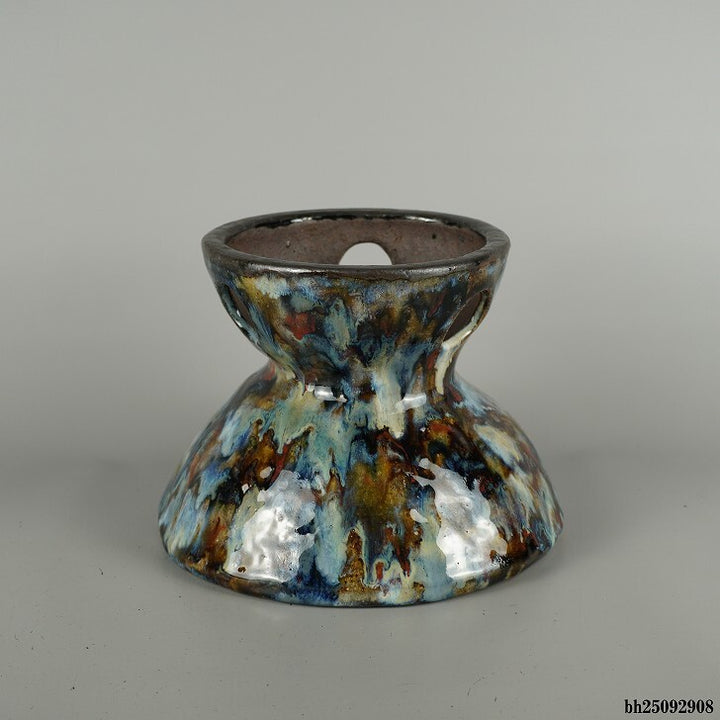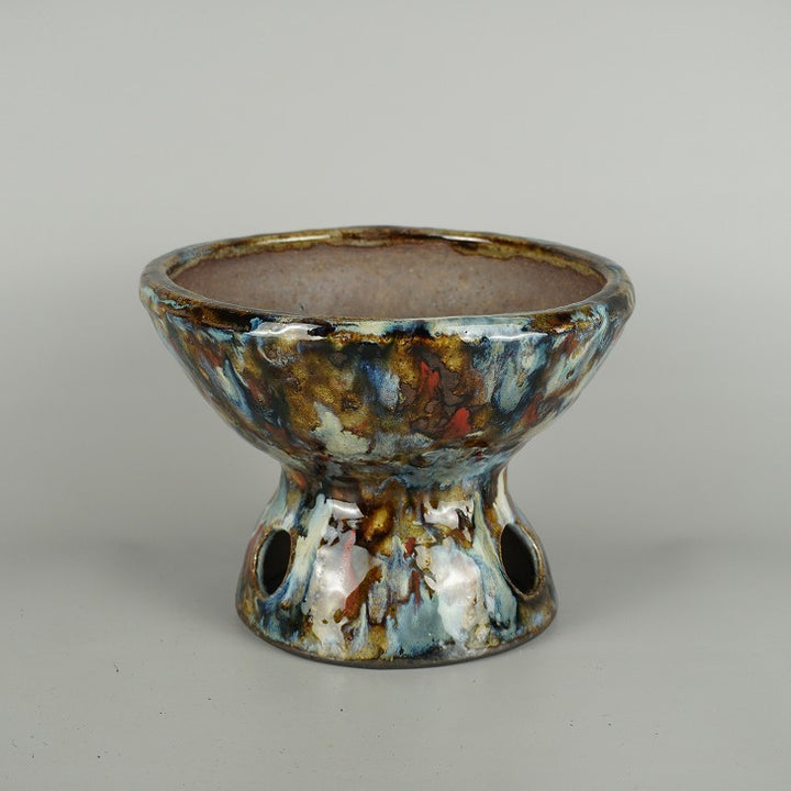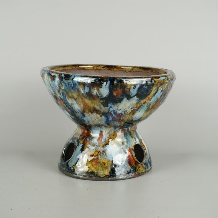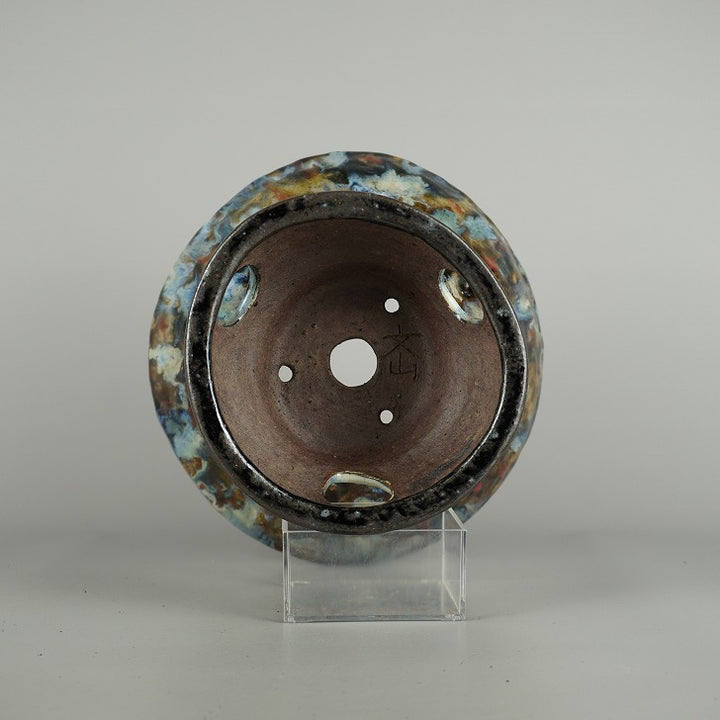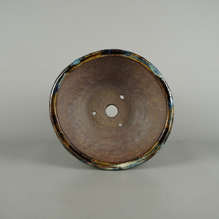 盆栽鉢 文山 越前文山 中型 長辺 約 21cm 丸鉢 高杯 釉薬 現品 新品 文山・越前文山 越前文山 1973年に鯖江園芸を開園する。 地元に伝わる越前焼に則って独自の作風を確立し、手びねりによる焼締の他、辰砂などの釉薬や象嵌を施したものがある。...