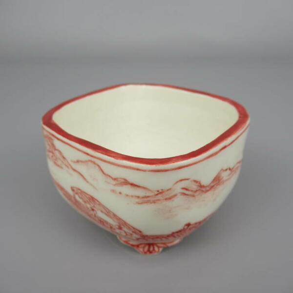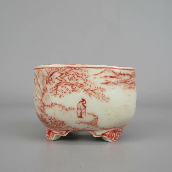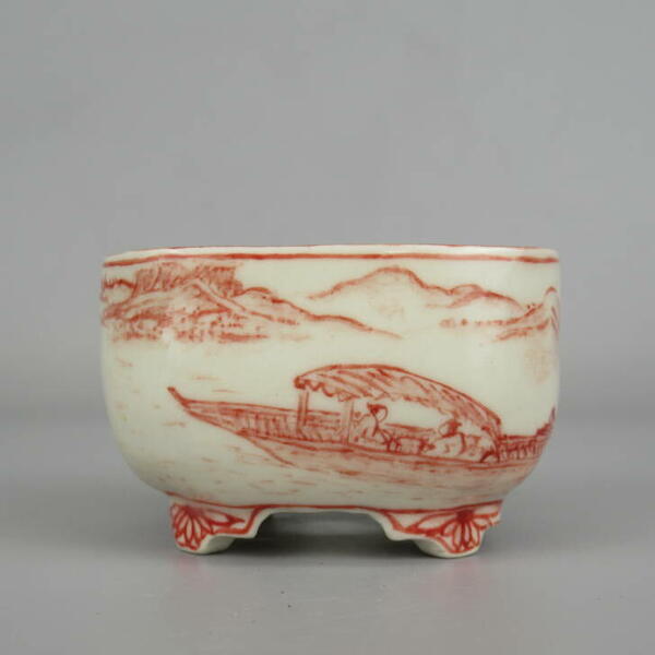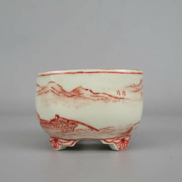 盆栽鉢 梢風 小鉢 長辺 約6.5cm 長方鉢 赤絵 山水 人物図 観賞用 新品 g1198420422