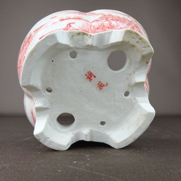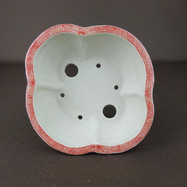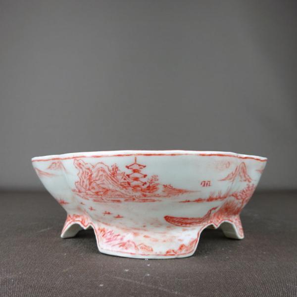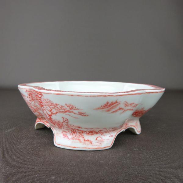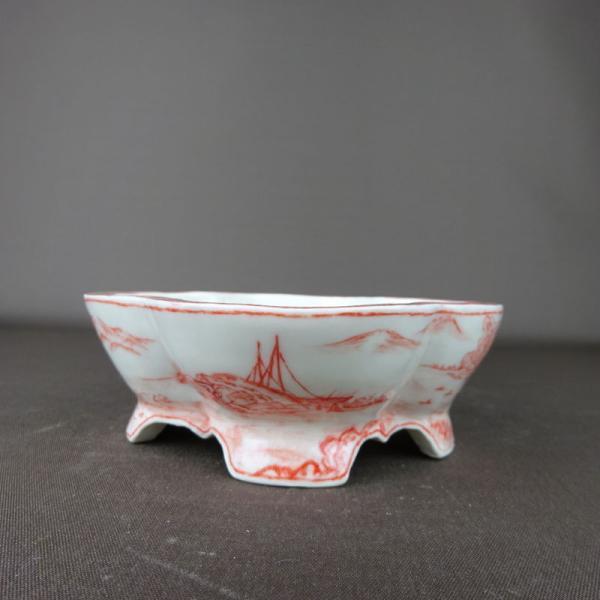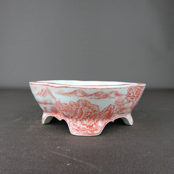 盆栽鉢 梢風 長辺 小型 約 12.5cm 木瓜鉢 赤絵 山水図 観賞用 現品 新品 品名梢風...