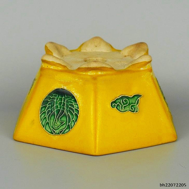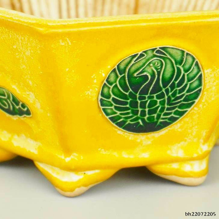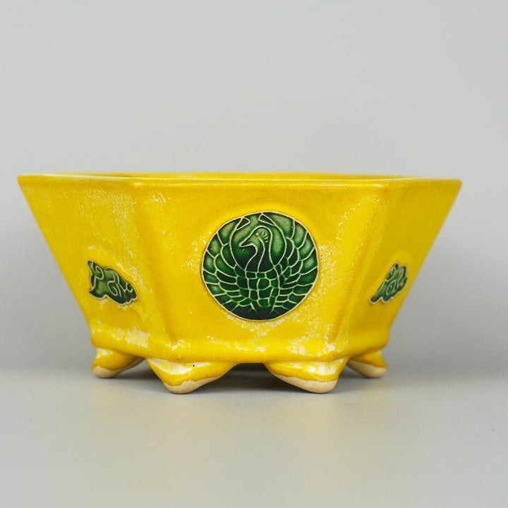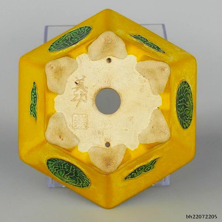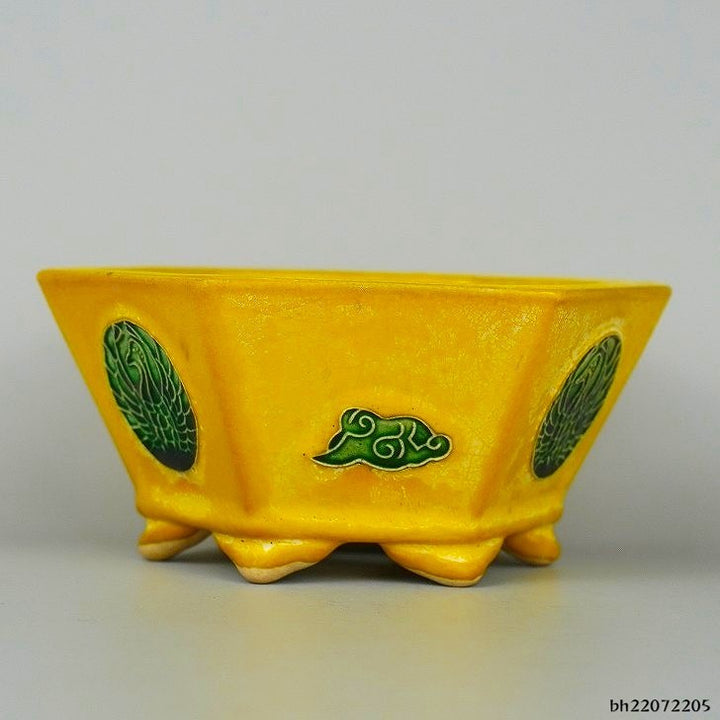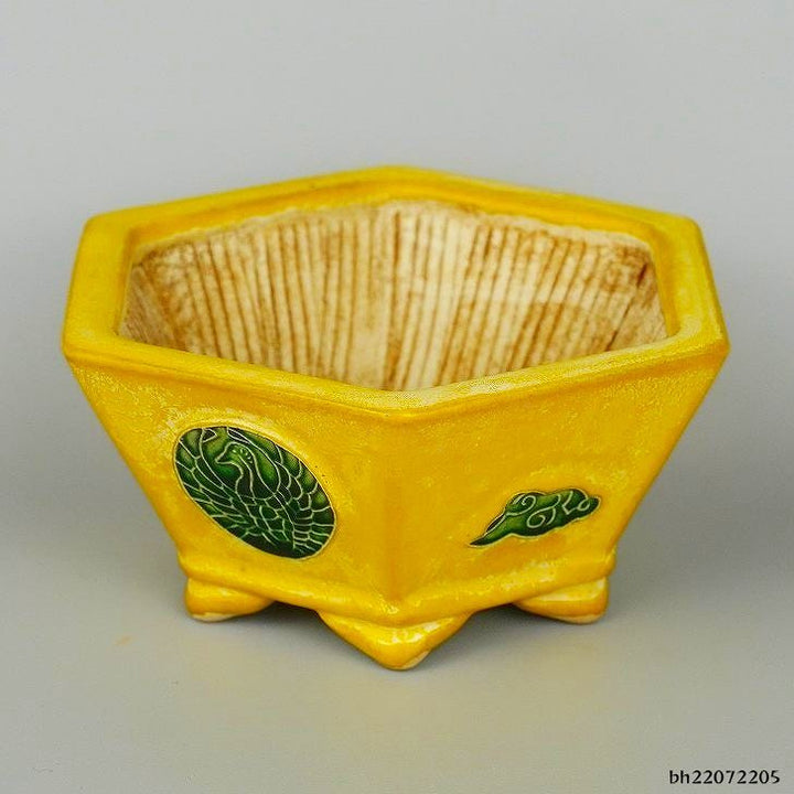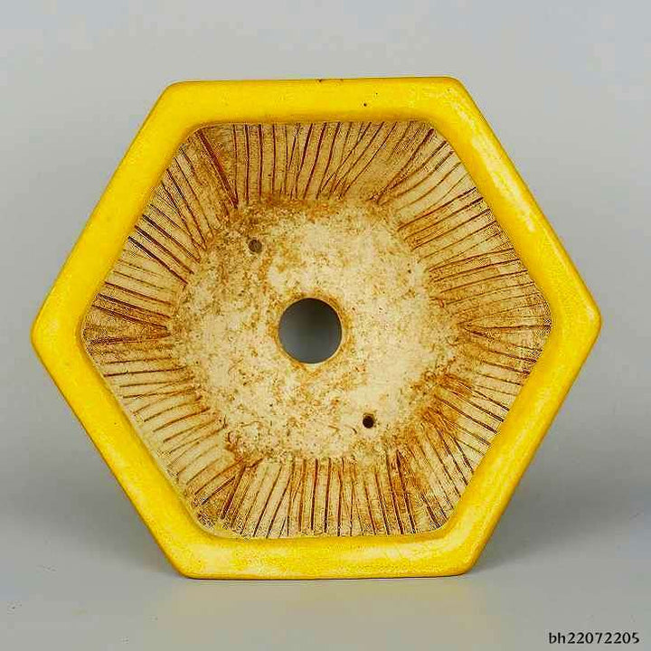 盆栽鉢 美功 小型 長辺 約12.5cm 六角鉢 黄釉 釉薬 中古鉢