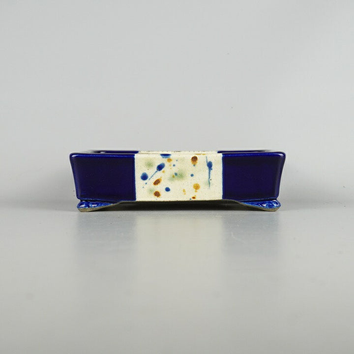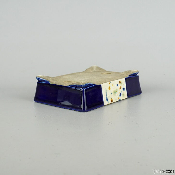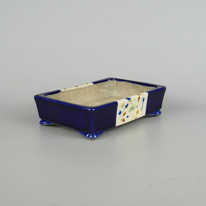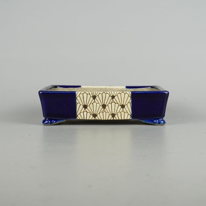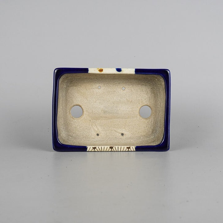 盆栽鉢 里美 寺畑陶園 小型 長辺 約15.7cm 長方鉢 雲足 色絵 水玉 扇 瑠璃 釉薬 新品 o1198427708