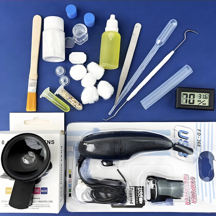 螞蟻飼養工具包含的18件工具:雙頭鉤,鑷子,滴管,營養液,餵食盆,餵水器,棉花,小塞,刷子,防逃粉,2ml種子,2ml產卵膏,15口徑堵水海綿一個,18口徑堵水海綿一個,5cm軟管,吸塵機,微距鏡頭,溫度濕度計