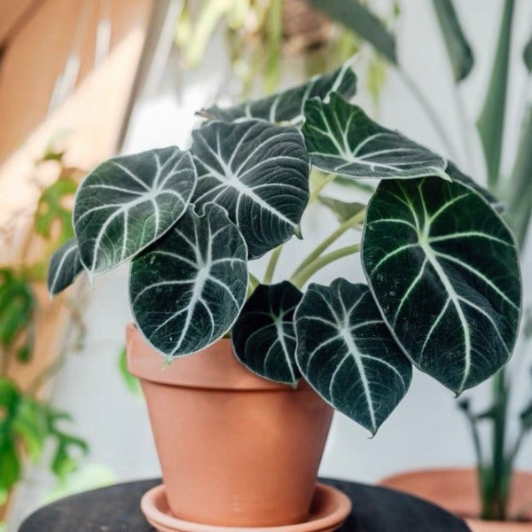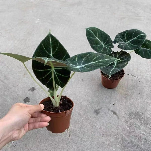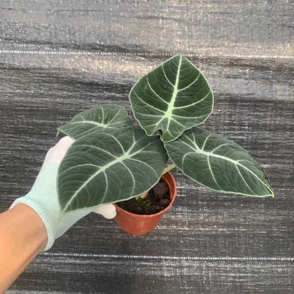 黑天鵝絨海芋是一款非常美麗的小型海芋品種,葉子幾乎呈黑色,心形,看上去像天鵝絨,也有銀白色的脈。所以叫黑天鵝絨海芋。
