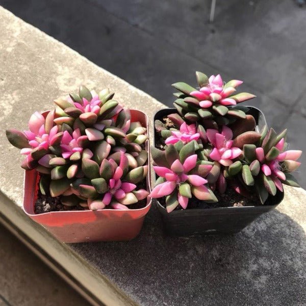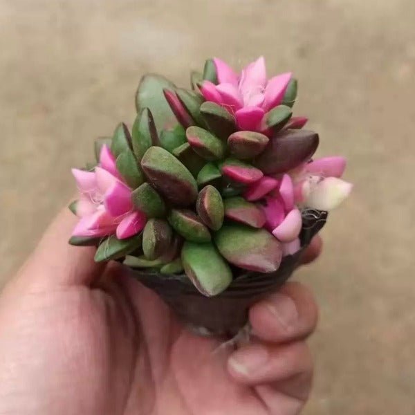 吹雪之松錦是馬齒莧科回歡草屬的斑錦品種,以其紅綠相間的螺旋葉序著稱。葉片呈細長披針形,表面帶有絲絨質感,在適宜環境下會呈現出粉紅、嫩綠與乳白的繽紛漸層。植株低矮且易群生,適合迷你盆栽栽培,展現如朝霞般絢麗的色彩變化。