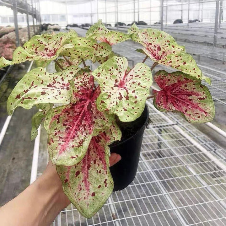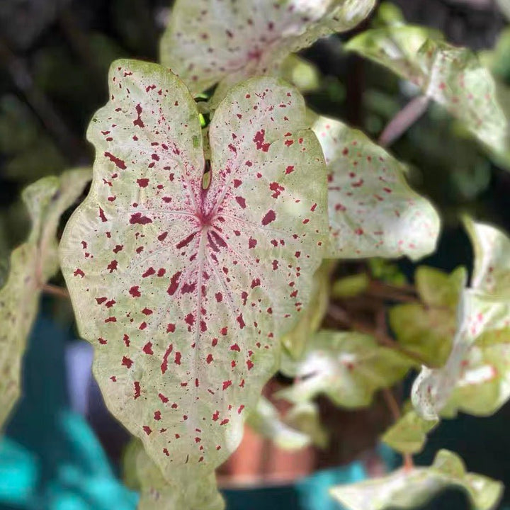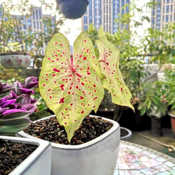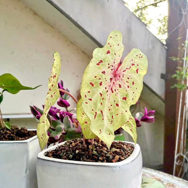 Caladium 'Miss Muffet' has lush, heart-shaped,lime greenleaves with red sparkles and red vien. It is generally disease and pest free that required little maintenance.